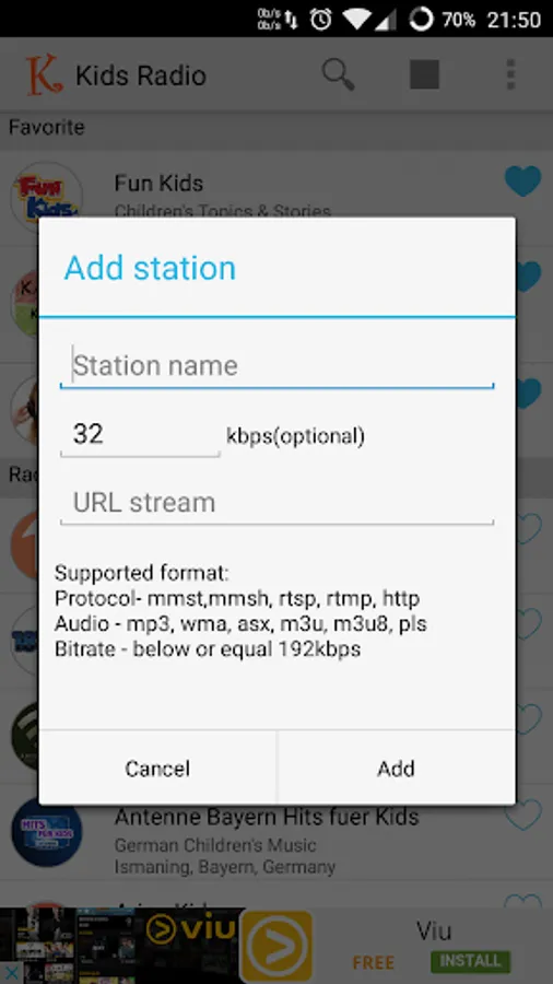If you know the URL of new streaming radio stations, you can add your own favourite stations. Mark your favourite channels to put them on top of the list for quick access.