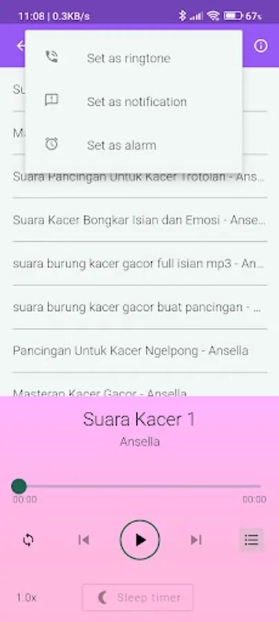 Listen to various sounds of kacer birds, such as ngeplong, ngobra, full isian, and more.