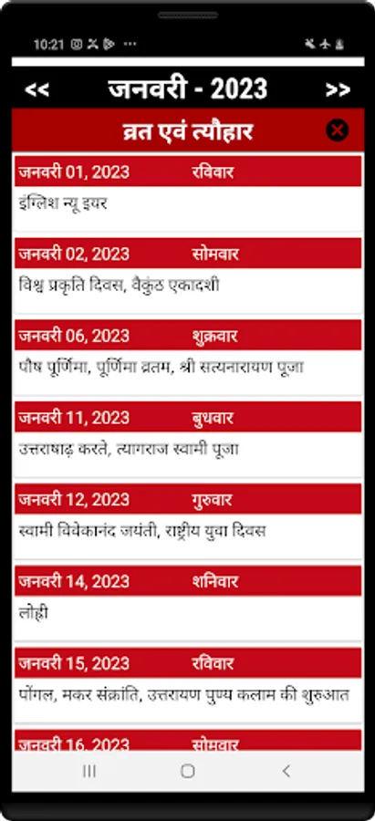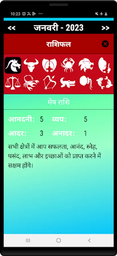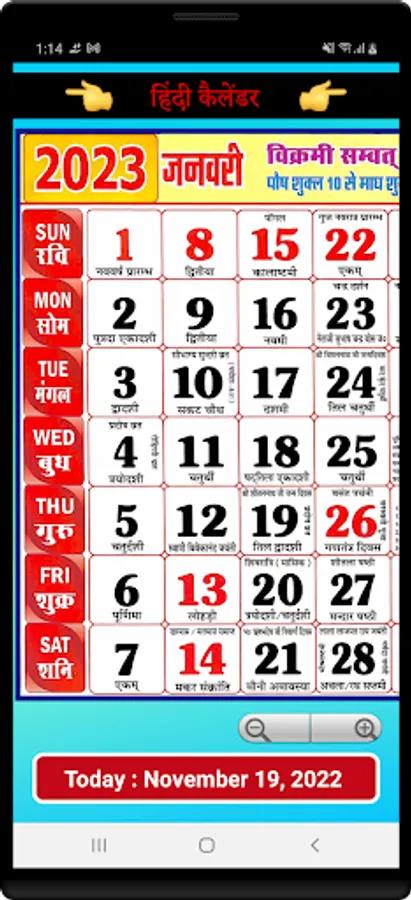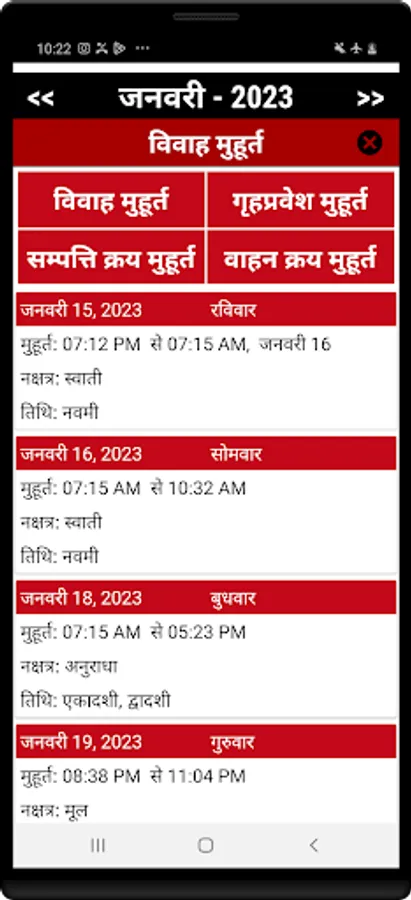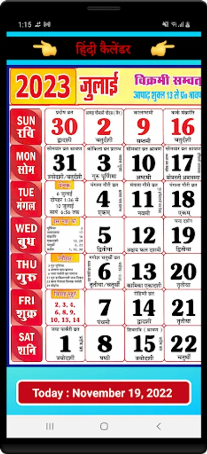 Hindi calendar 2023 app has high quality monthly calendar that allows you to view maasam, vaaram, thithi, and nakshatra information throughout 2023 in Hindi.