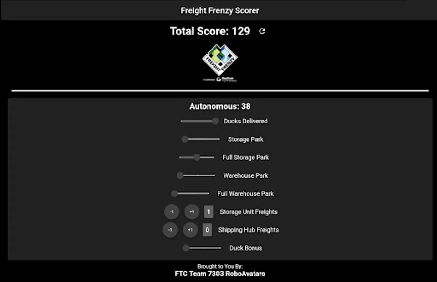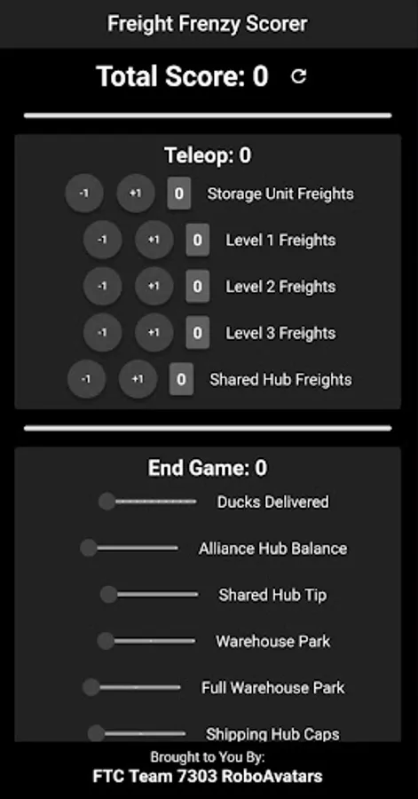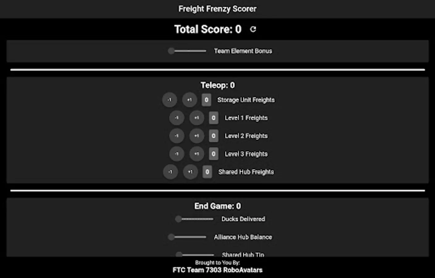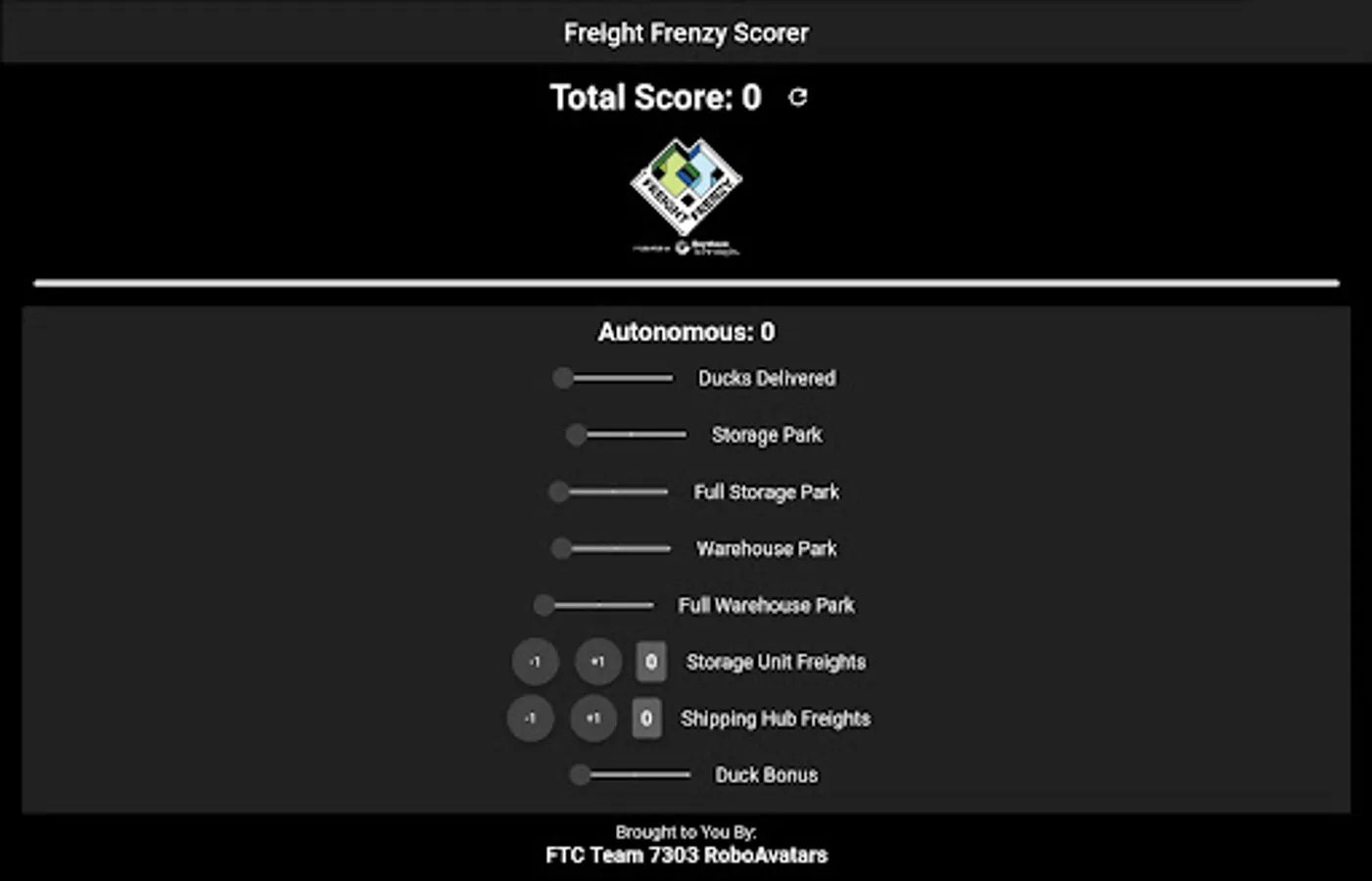 Freight Frenzy Scorer is an app created by FTC Team 7303 RoboAvatars. It is designed to help FTC teams with driver practice, scouting, strategizing, etc. This app features a simplistic design and an intuitive UI.