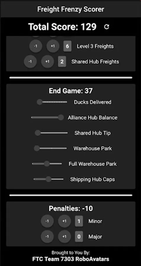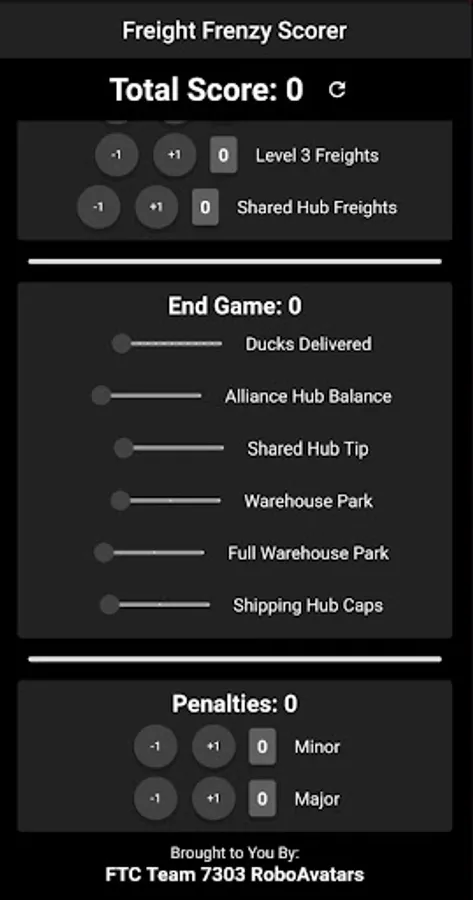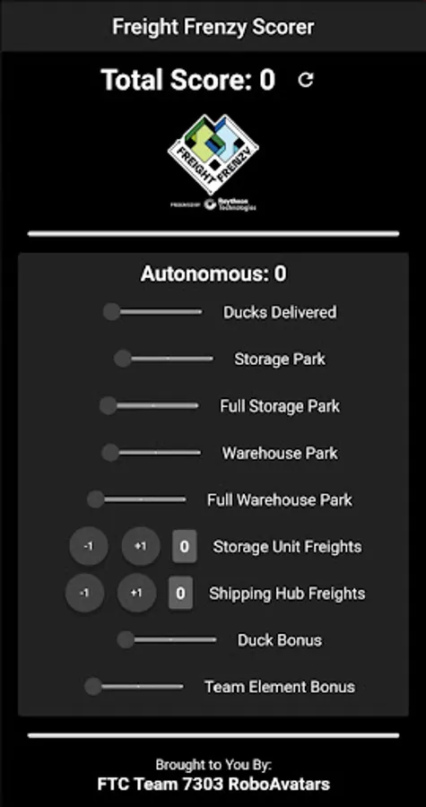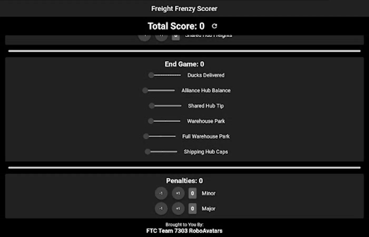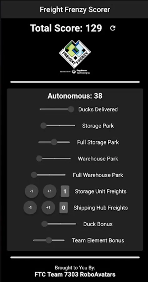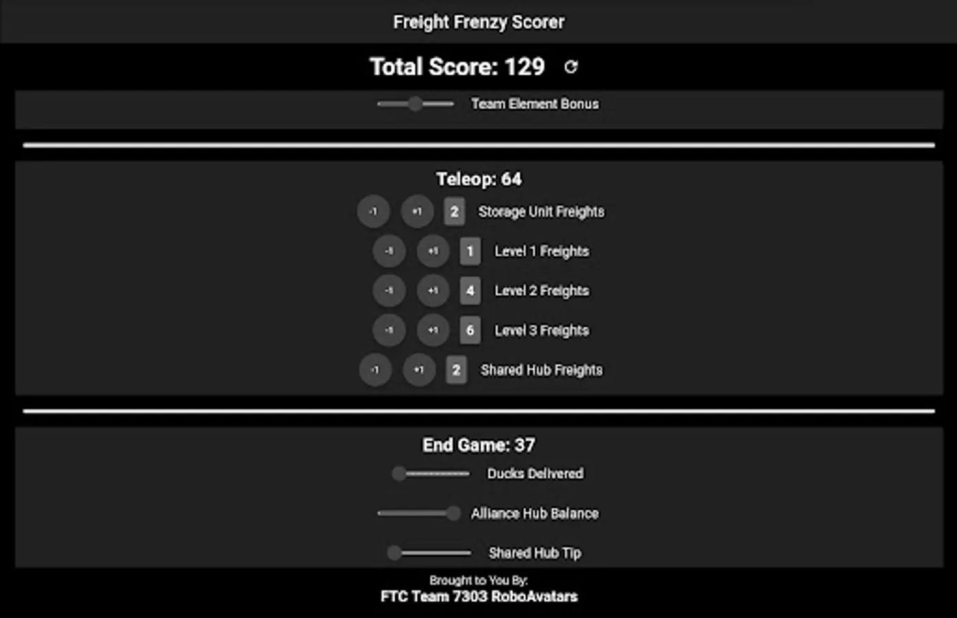 Freight Frenzy Scorer is an app created by FTC Team 7303 RoboAvatars. It is designed to help FTC teams with driver practice, scouting, strategizing, etc. This app features a simplistic design and an intuitive UI.