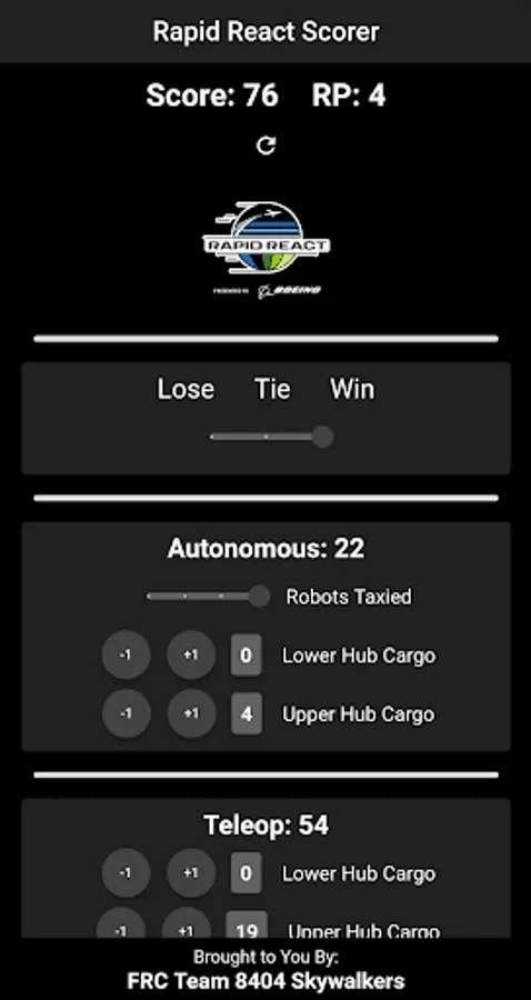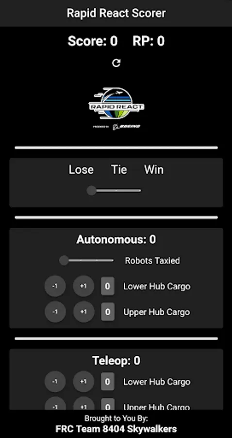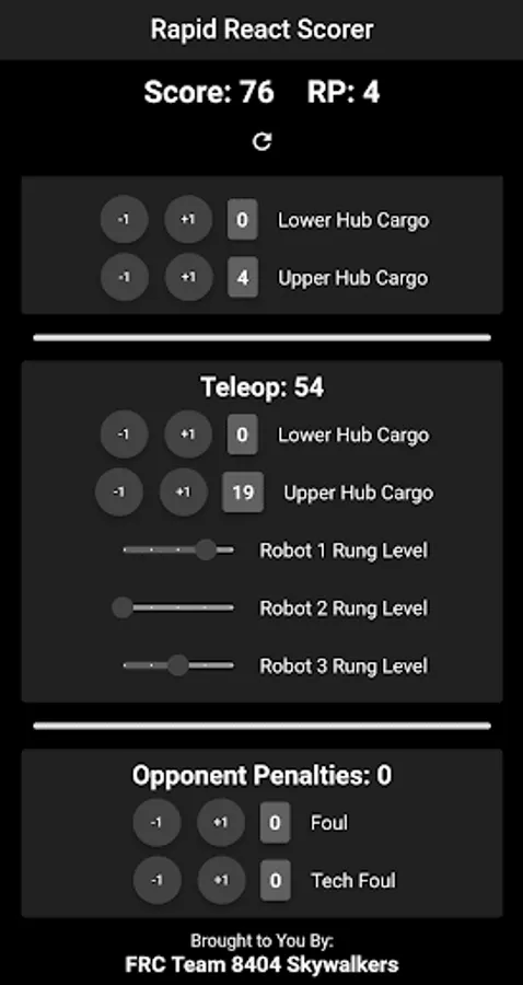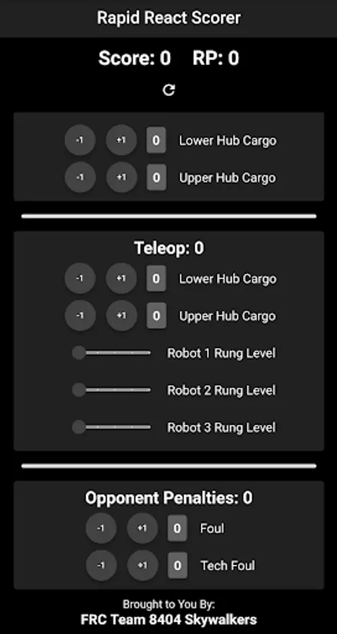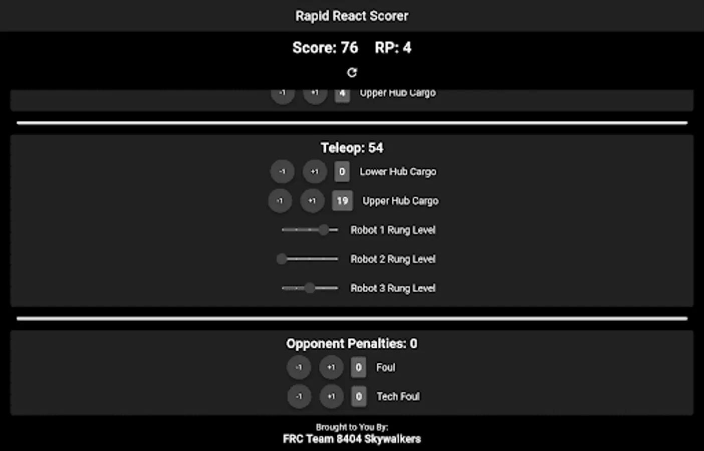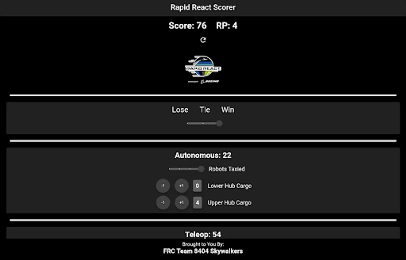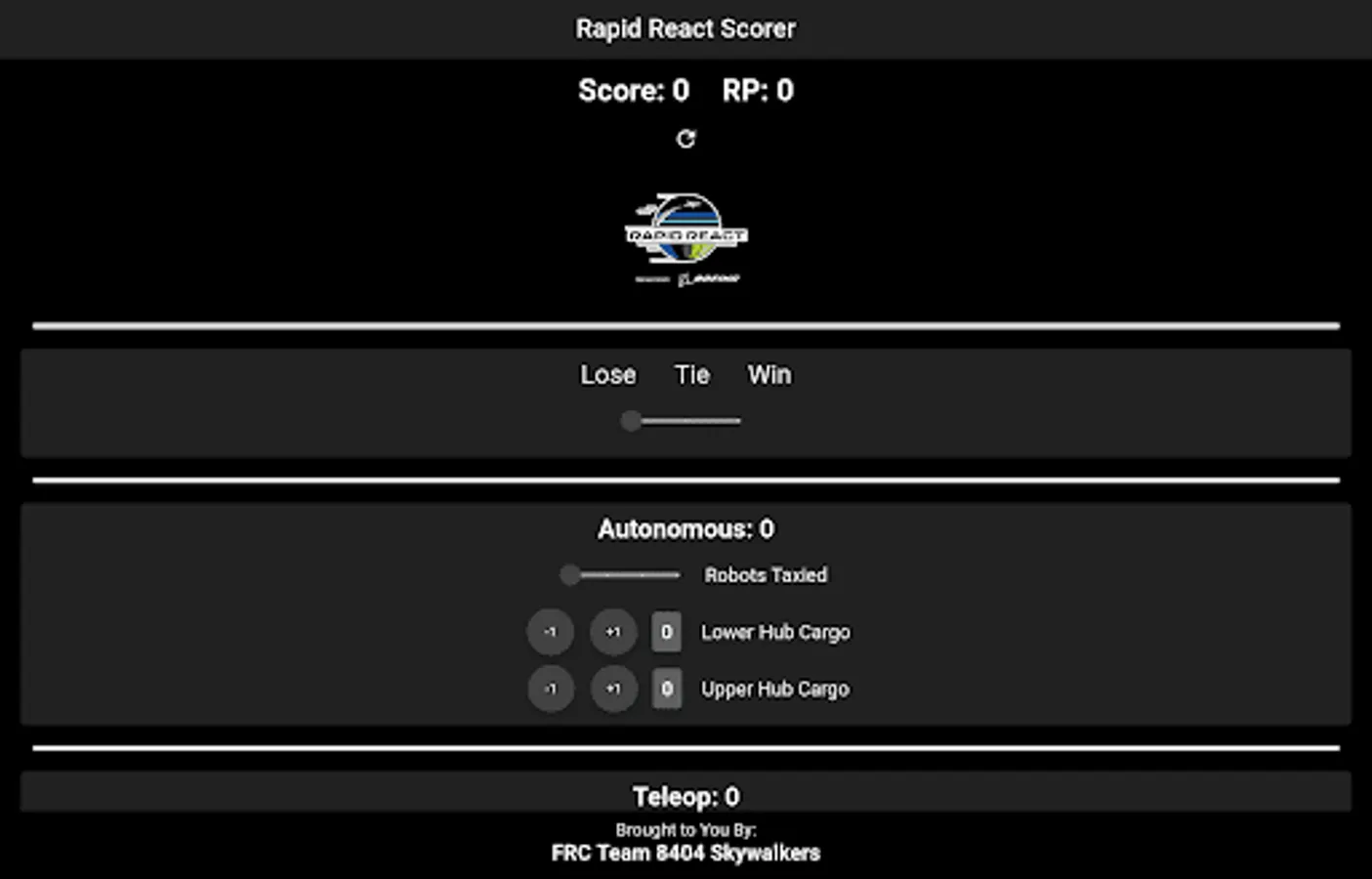 Rapid React Scorer is an app created by FRC Team 8404 Skywalkers. It is designed to help FRC teams with driver practice, scouting, strategizing, etc. This app features a simplistic design and an intuitive UI.