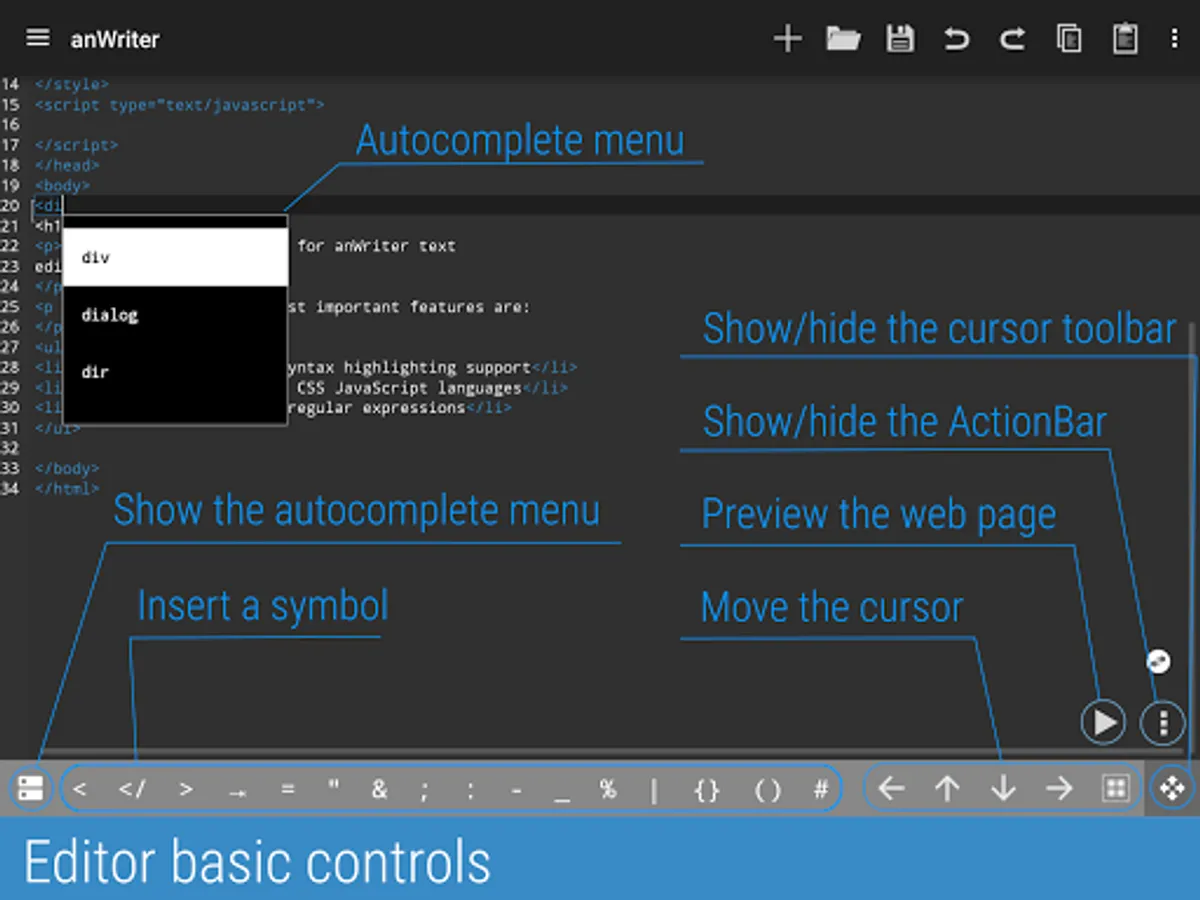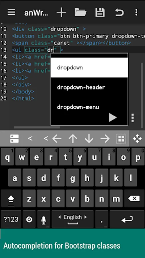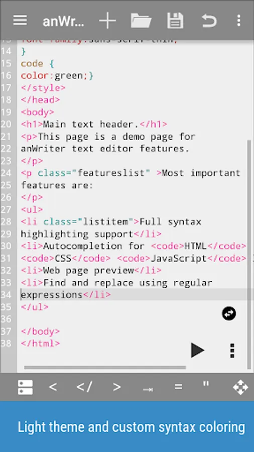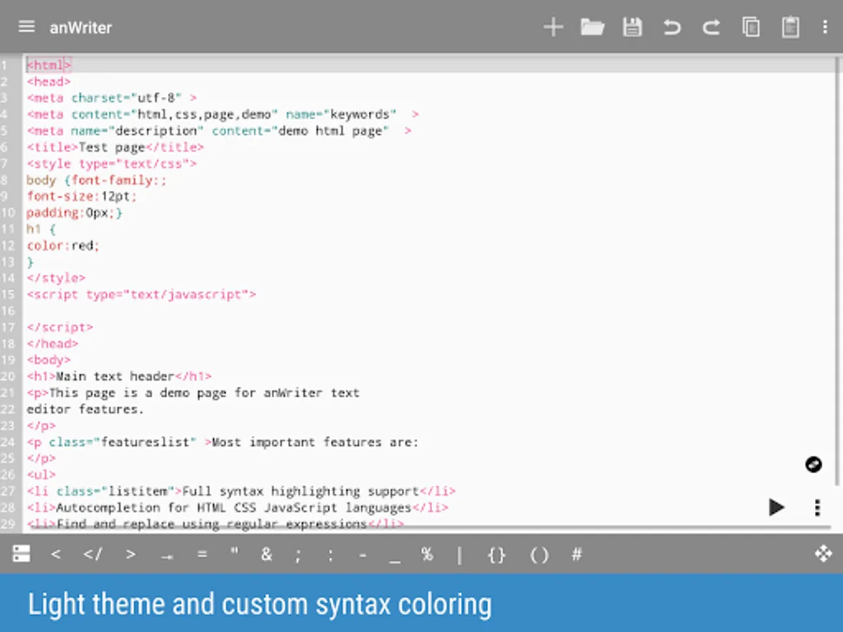 Line wrap, unlimited redo , autocomplete support for PHP and SQL , syntax colouring settings , quick switch between documents, send file to another app (e.g. Google Drive) .