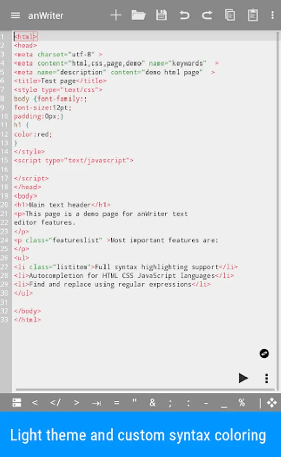 Besides HTML, CSS, JavaScript our editor supports syntax highlighting for C/C++, Java, Python, LaTeX. Also, it offers autocompletion for C and Python standard functions and keywords.