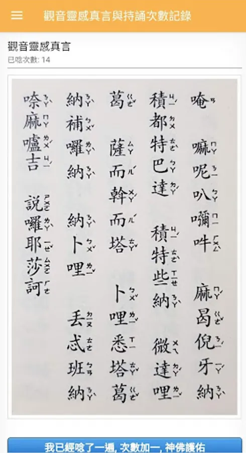 每唸一次,就按下畫面上的按鈕一次,會為您記下唸誦的次數!每天打開APP持誦此咒,利益頗多。祝福您!