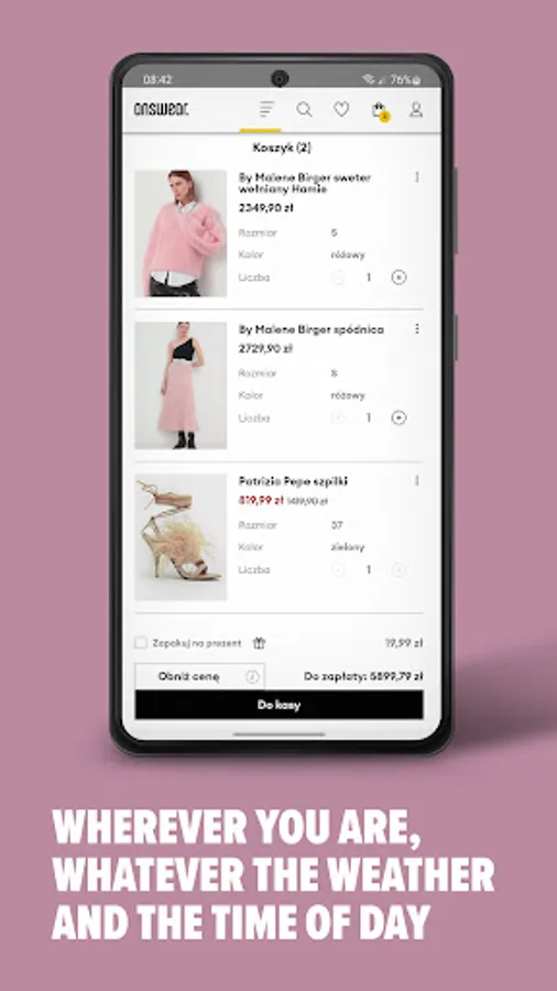 Sports, denim, fashion and lifestyle brands, limited designer collections and premium lines await you in the app, together more than 200 000 products for every season and occasion. You will find a wide selection of clothing: from jackets, coats, jumpers and sweatshirts to dresses, shirts, skirts, trousers and more. We also have a collection of various models of footwear, including: winter shoes, knee high boots and ankle boots, elegant stilettos and ballerinas, sneakers and trainers for fans of comfort, as well as sports and outdoor shoes. You can complete every look with an accessories: a fashionable handbag, jewellery, glasses, a watch or a belt. In case of a bad weather you will appreciate a warm hat, gloves, scarf and umbrella.