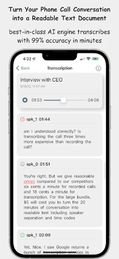 - Get timestamped transcription of the recorded phone call conversation if needed.