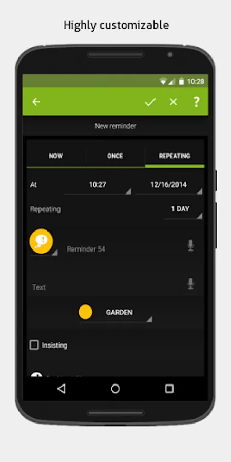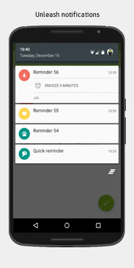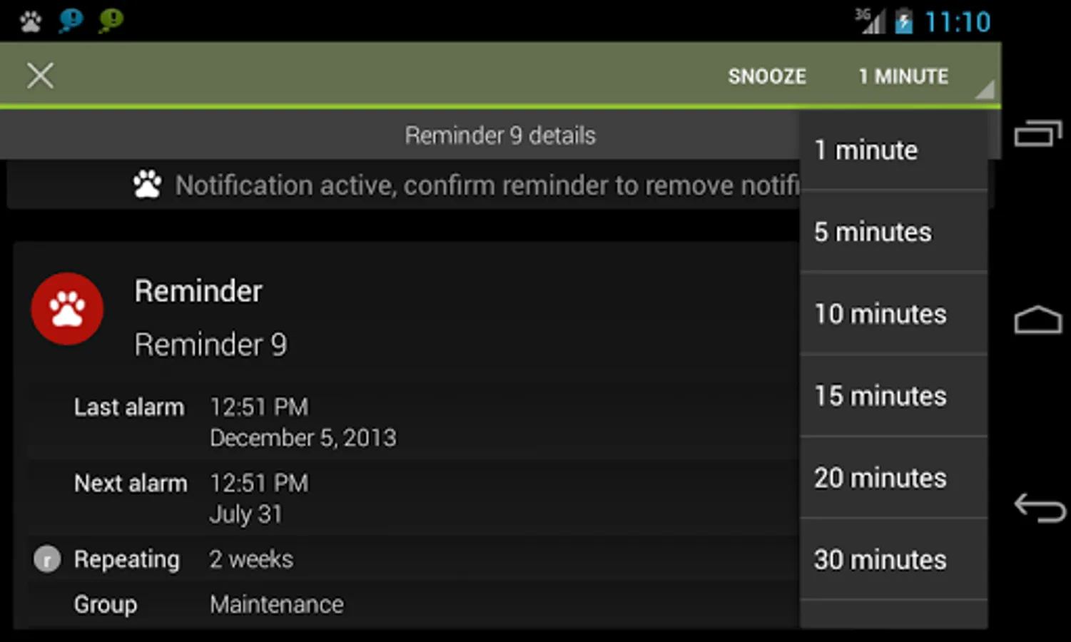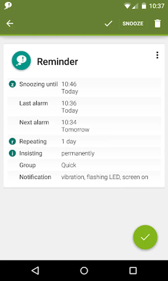 If you want to buy time to complete tasks, hit the snooze button and it will bug you again later. You can also create insisting reminders. Those keep alarming you again and again until you have finished the task.