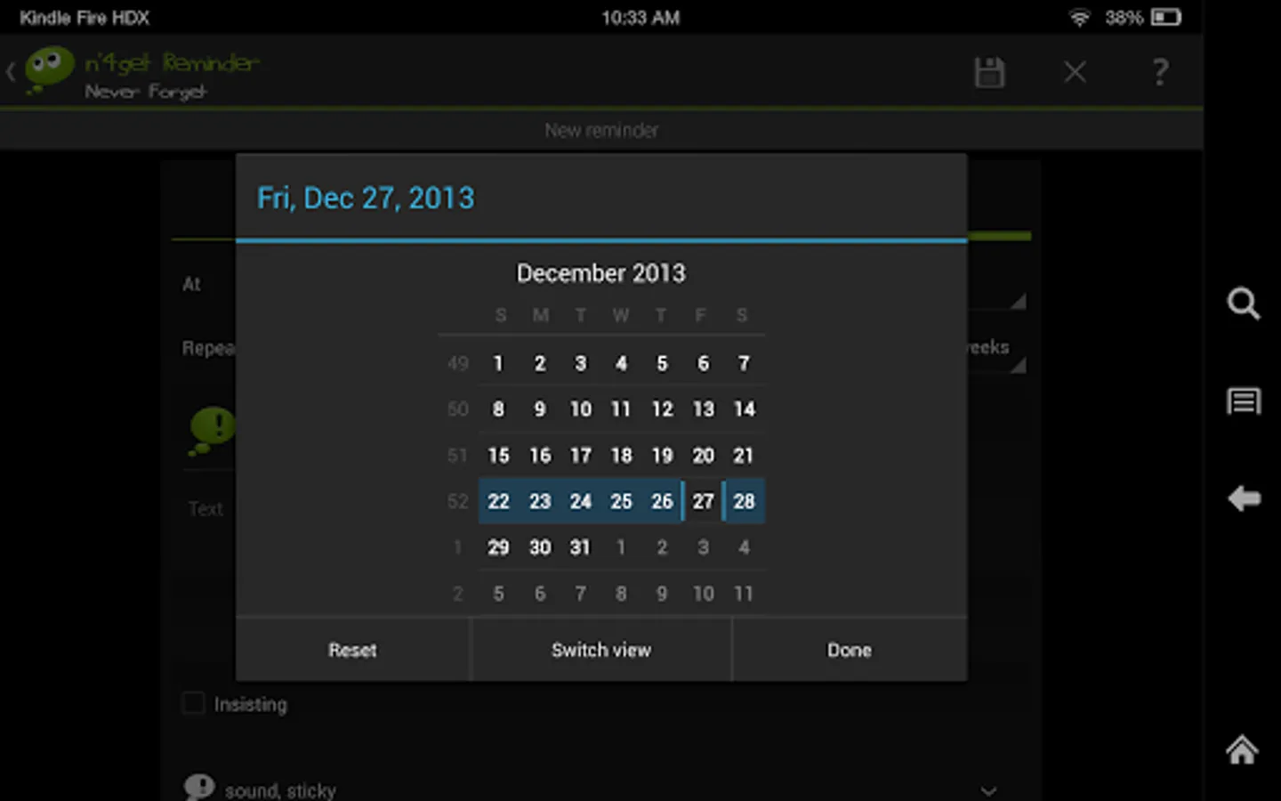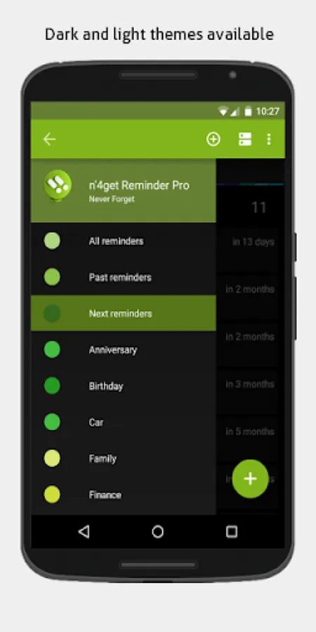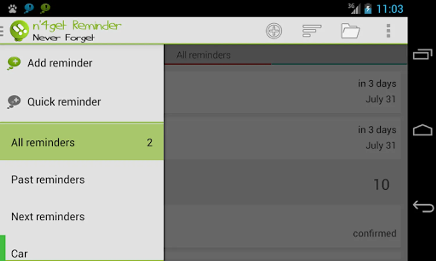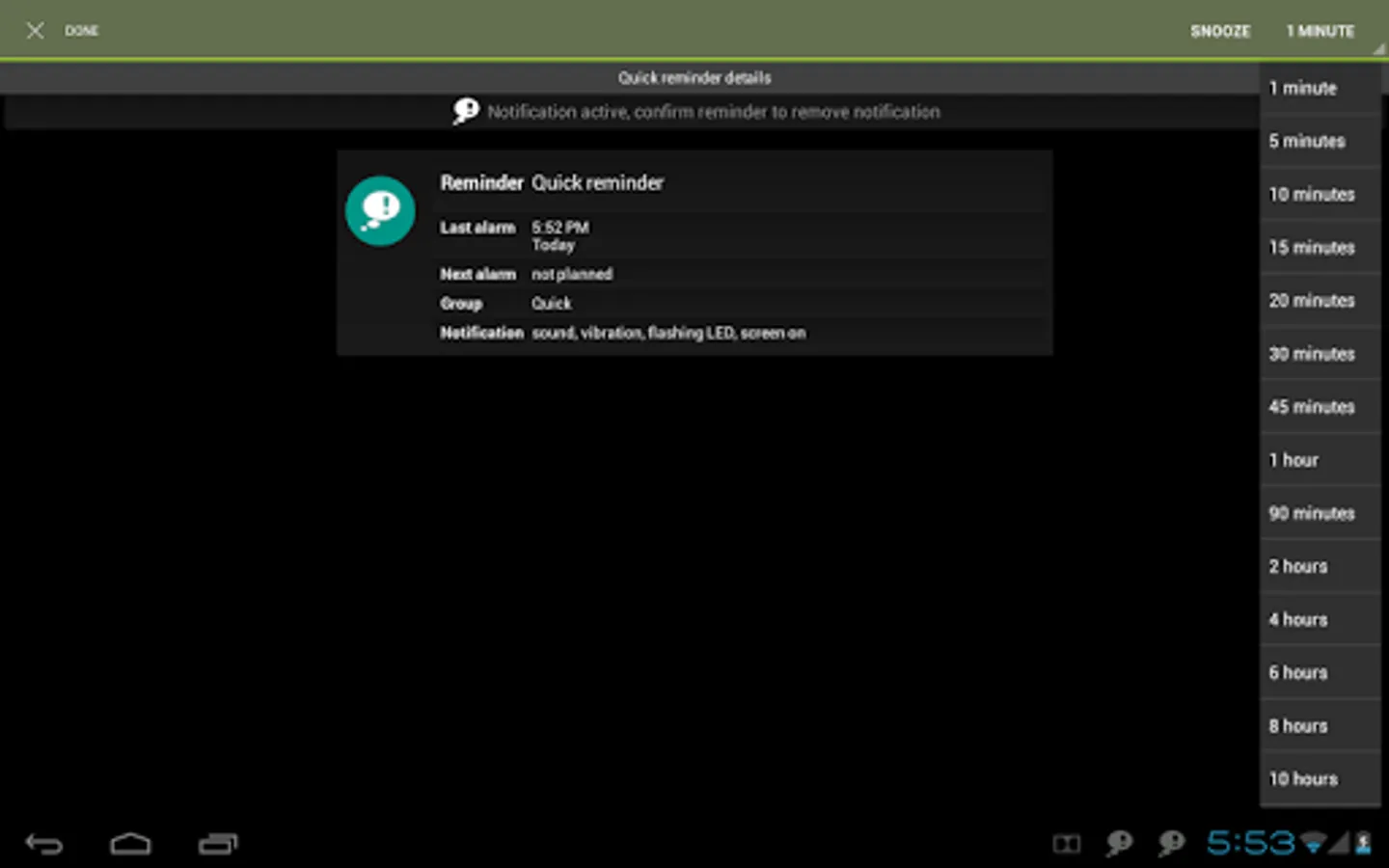 n'4get Reminder adds own reminders to the Android task bar. Notify instantly, on a date or repeatedly. Customize reminders with icons, sound, vibration and much more. Use also as a handy to-do list or task planner.