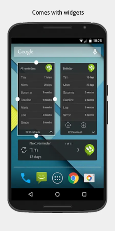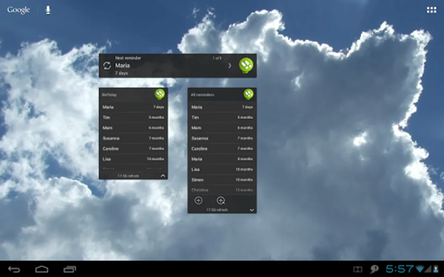 Two different home screen widgets are available. The n4get bar widget is for next reminders. The bigger n4get list widget shows more reminders and can be resized. It can also land on the lockscreen of a Jelly Bean device.