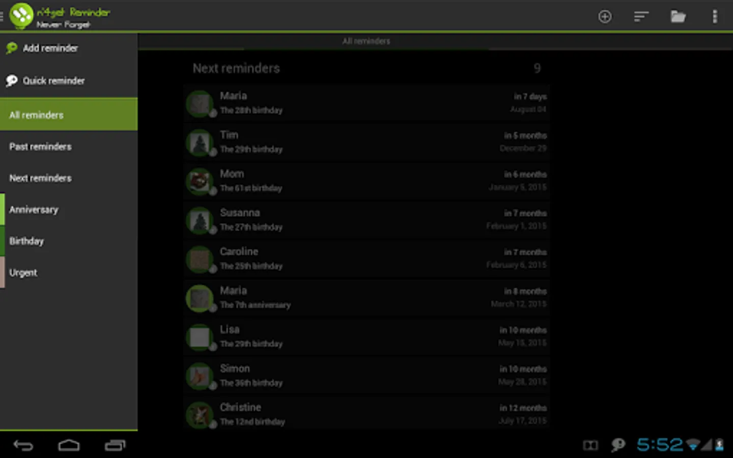 The user interface is also optimized for the use on tablet devices and runs smoothly on 7" and 10” screens. n'4get Reminder uses only a limited amount of system resources and does not drain the battery, even with a large number of reminders in place.