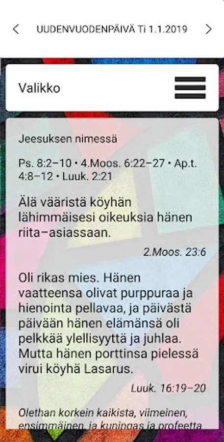 Good words for every day of the year! The Word of the Day has been published in Finnish for over 100 years, but now you get daily Bible texts on your phone. Two Signs of the Bible have been selected for each day of the year: the first, the passphrase, is the text of the Old Testament, followed by a passage in the New Testament explaining the passage. Two additional texts have been added to the supplementary text of the day's texts.