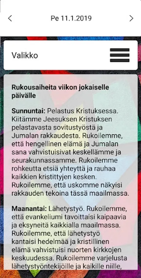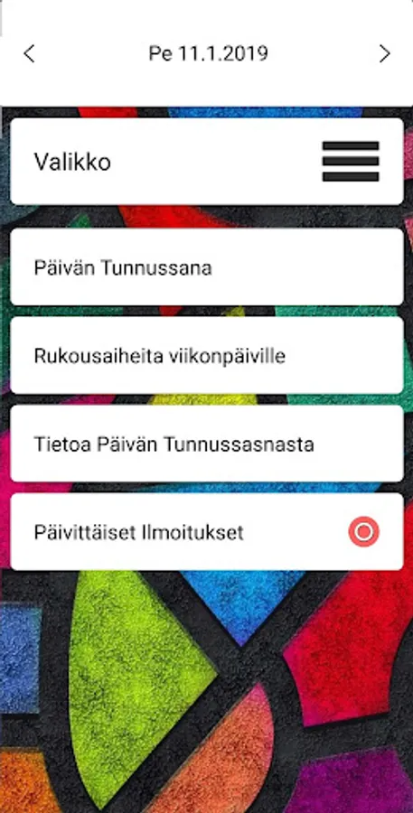 The Daily Password Mobile application is lightweight and easy to use. On the front page are the texts of the day, the top banner, on the other hand, will find a calendar for you to go to the texts of the day you want. From the drop-down menu, you can find information about the Day Prayer Word and the Finnish Evangelical Society of Karelia. The menu also has a button to turn on notifications that resemble new texts every day.