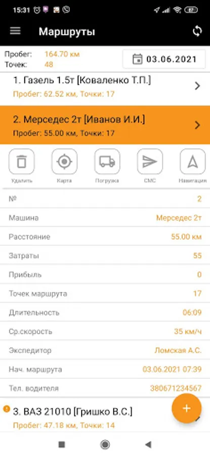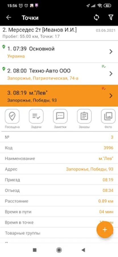 The application, as part of the system, displays the route calculated by the logistician, the list and order of bypassing address points, the list of goods and tasks, and the customer's contact information.