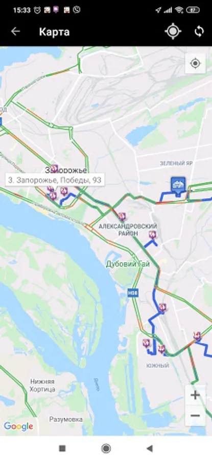 The application works as a navigator and also records the current location (GPS) in the background and transmits the route track to the general system.