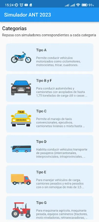 Each type of license has its own question bank and simulator. You can practice with type A, B, C, D, E and F license simulators. Likewise, you can download the questions for type A, B, C, D, E and F licenses, or review and answer them from this page .