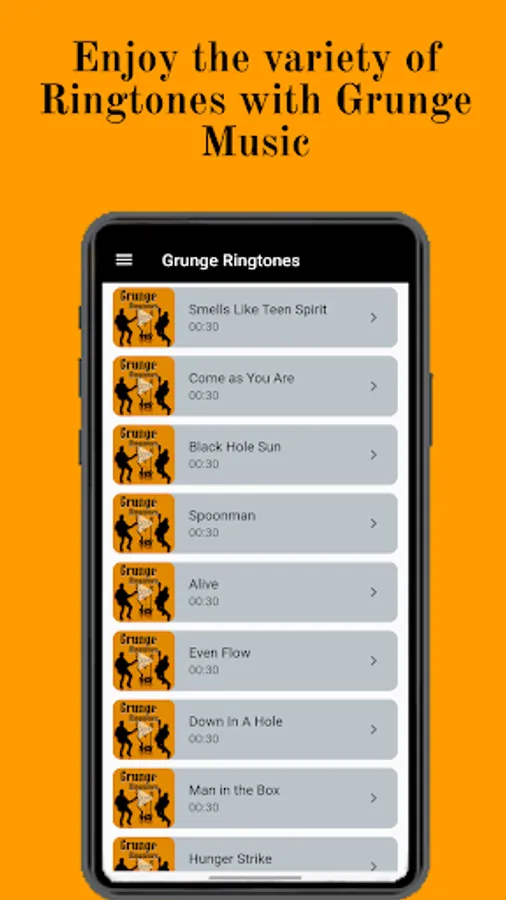 Our App contains a great variety of ringtones with sounds of grunge music from the 90s that will make your Android device unique in its notifications, alarms or calls.