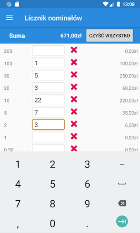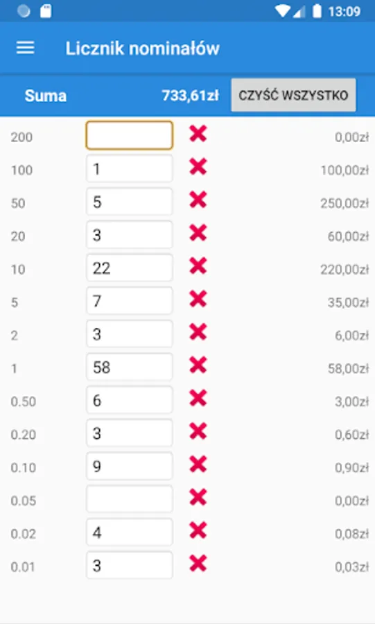 The program allows you to enter the amount of each type of coins and banknotes. After entering the amount, application calculates the total amount of the cash.