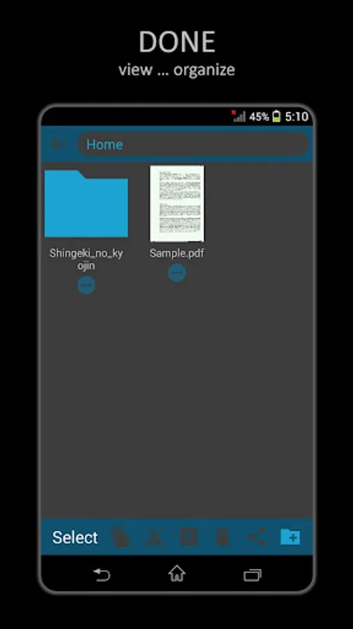 Swipe to switch between main screen (camera) and document manager. Copy, move, delete and share files. Create new folder. Thumbnail view of files.