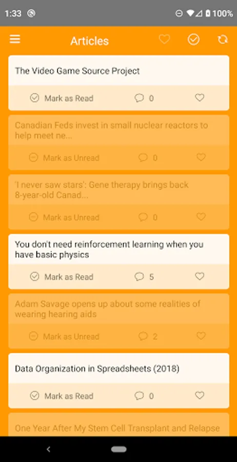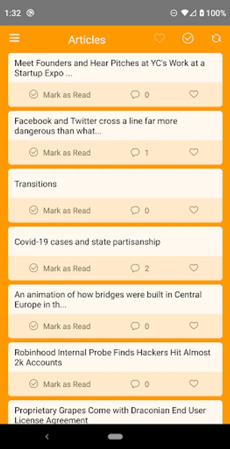 News reader for top 100 stories pulled from Hacker News (news.ycombinator.com) web feed. Made using React Native.