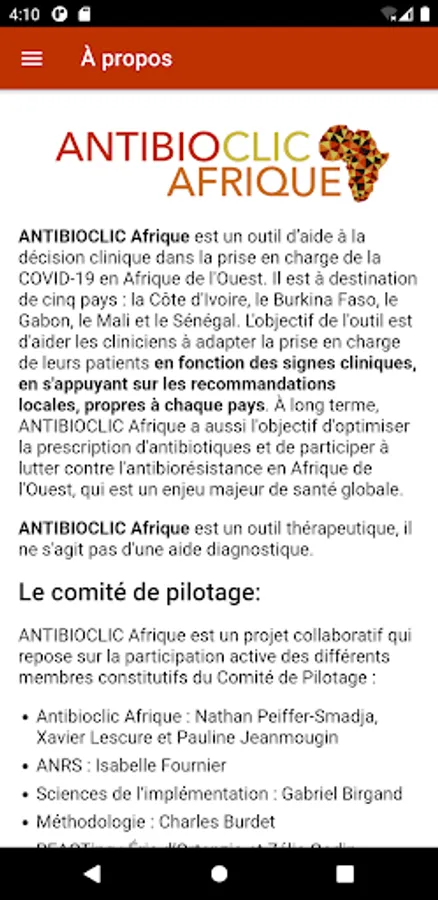 Antibioclic Africa is a clinical decision support tool in the management of COVID-19 in West Africa. It is destined for five countries: Côte d'Ivoire, Burkina Faso, Gabon, Mali and Senegal. The objective of the tool is to help clinicians adapt the management of their patients according to clinical signs, based on local recommendations, specific to each country. In the long term, Antibioclic Africa also aims to optimize the prescription of antibiotics and participate in the fight against antibiotic resistance in West Africa, which is a major global health issue.