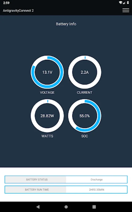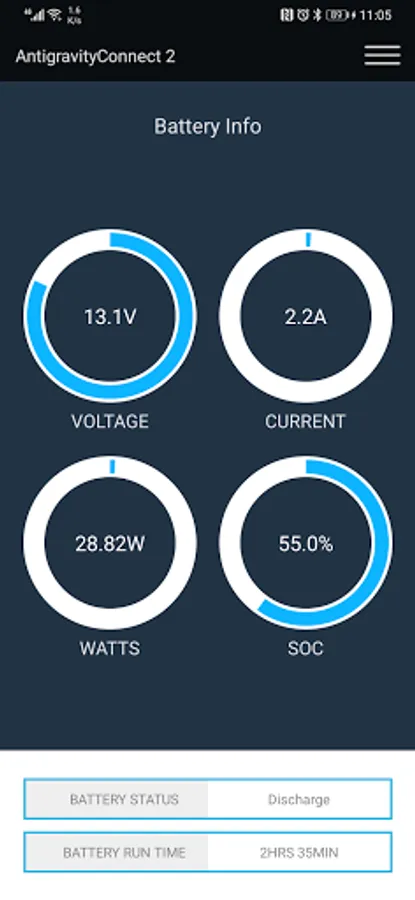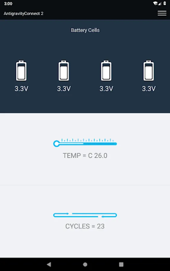 The AntigravityConnect V2 Battery Monitoring App allows the user to connect the Antigravity DC-100-V2 Deep Cycle Battery to Android mobile phones, tablets and other devices to check the real-time Battery Information including State of Charge, Voltage Level, incoming and outgoing Current levels, Battery Temperature, as well as providing individual Cell Voltages and Alerts for Battery Status.