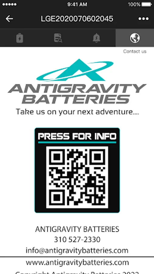 The "AntigravityConnect DC" Battery Monitoring App allows the user to check the real-time Battery Information including State of Charge, Voltage, incoming and outgoing Current, Battery Temperature, as well as providing individual Cell Voltages and Alerts for Battery Status. Note: This application is only suitable for Antigravity DC-xxx Models of our LiFePO4 batteries.