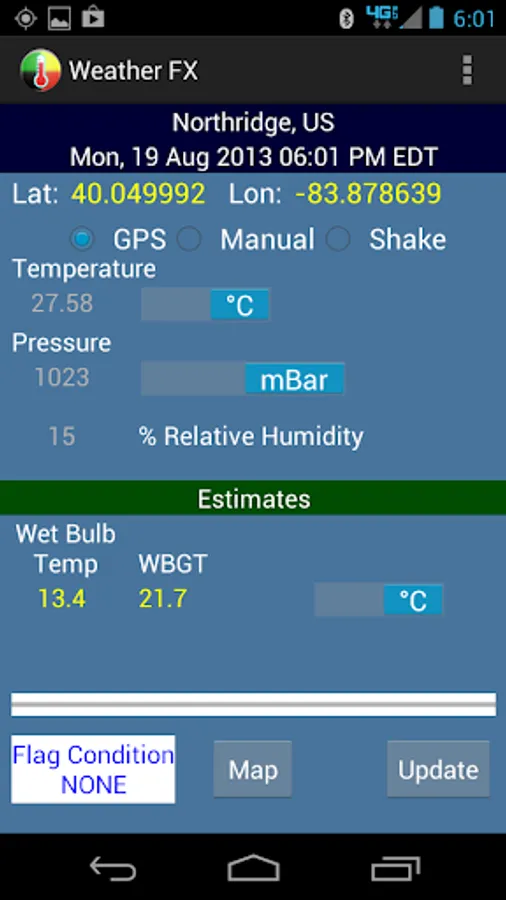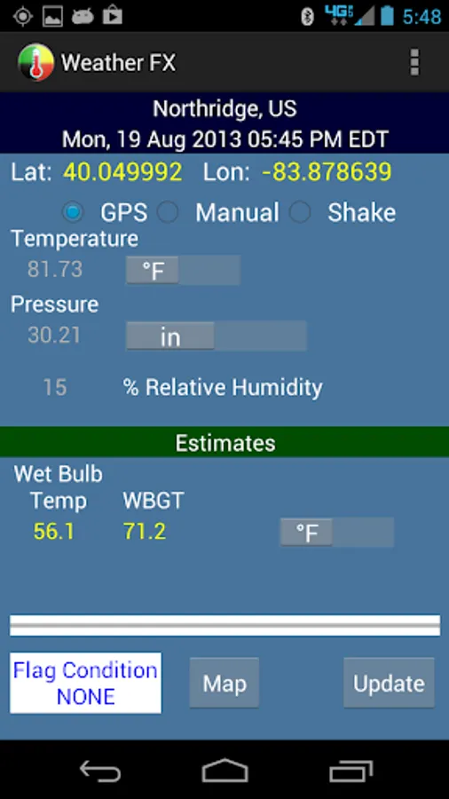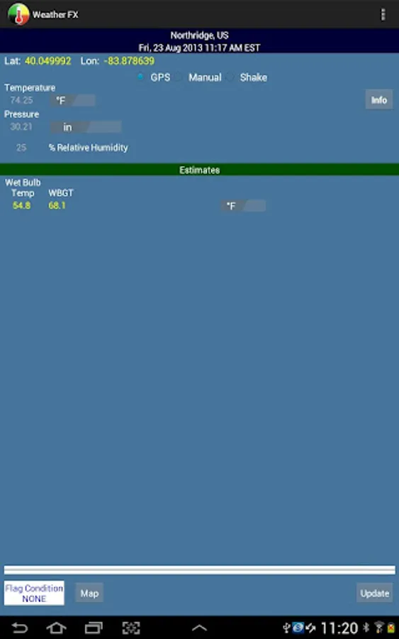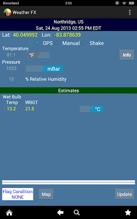 Once you accept the prompt to acquire the GPS position, the Latitude and Longitude labels will be populated. Click the “Update” button and the app will populate the temperature, pressure and humidity text fields based the closest weather station ID to your position. The app will then calculate the wet bulb and WBGT temperatures. You'll also notice that the WeatherFX app will place the location name and time of the reading at the top of the screen. This way you will know if the readings are in your location and timely.