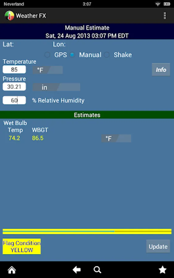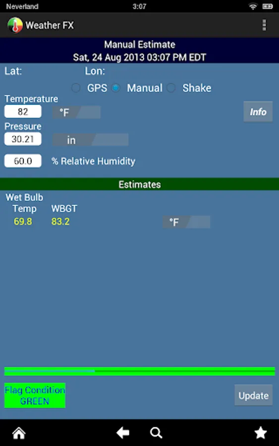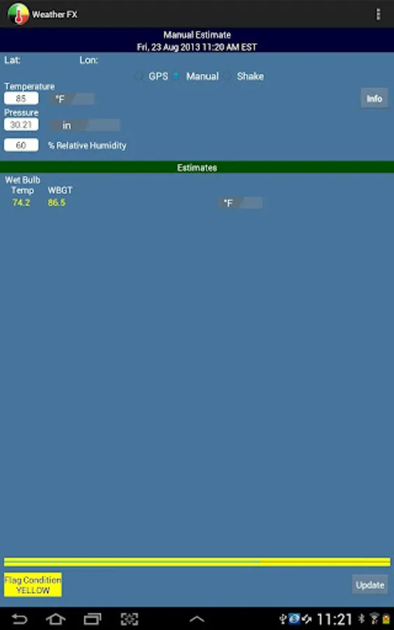 Besides acquiring the weather from GPS you may get your own estimates for wet bulb and WBGT temperatures by typing temperature, pressure and humidity into the respective text fields. Click the “Manual” segmented button, enter the white fields followed by clicking the “Update” button.