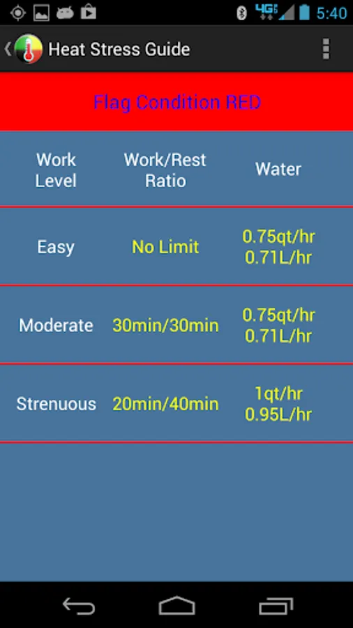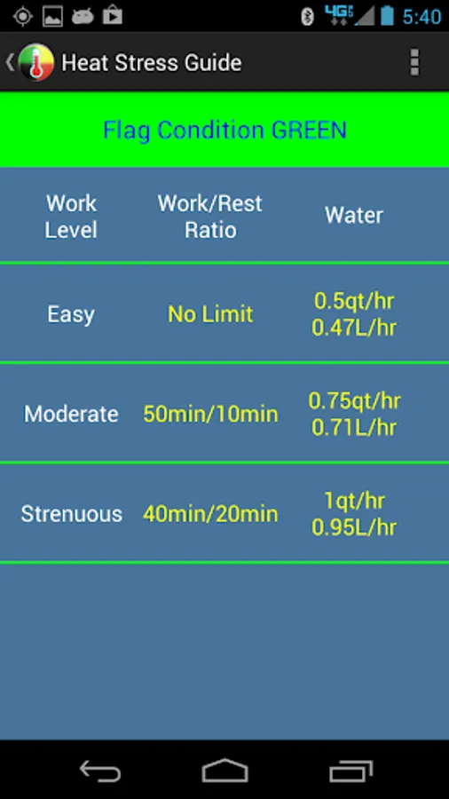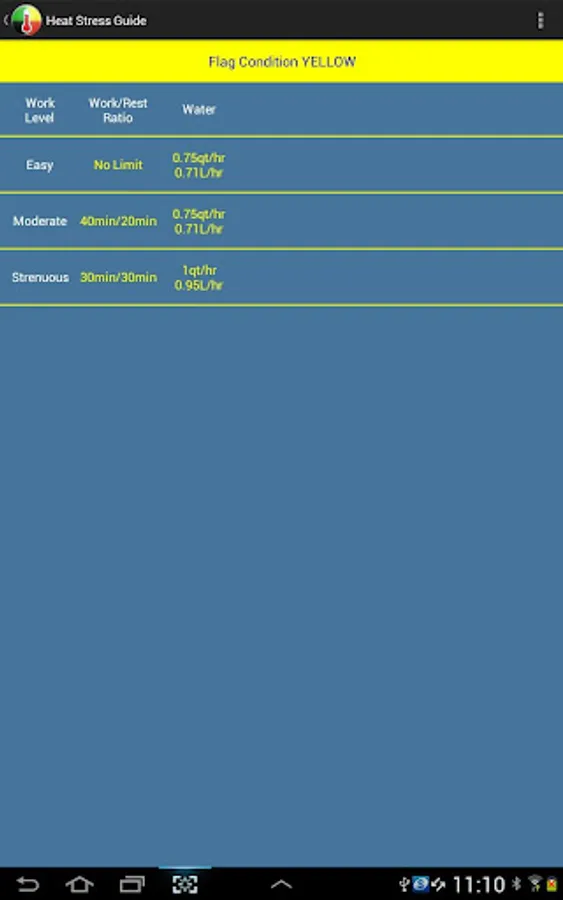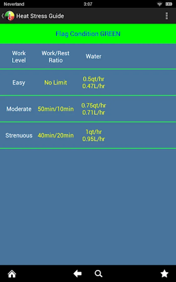 After an update you will be presented with a flag condition button on the bottom left of the screen. The flag condition is derived from the WBGT estimate. If the flag condition is not “NONE”, you may click on the condition to yield work to rest ratios and water consumption given the current estimated flag condition. These figures are posted as a quick and portable reference only. Guidance for these figures are acquired from the U.S. Marine Corps Order 6200.1E dated June, 2002. You are strongly advised to read the complete guidance to know what each entry means.