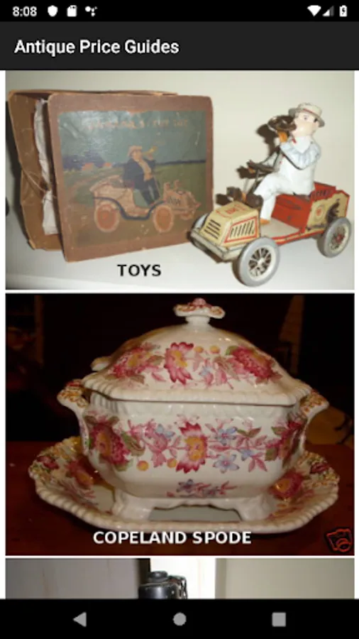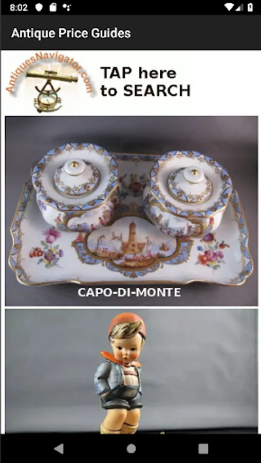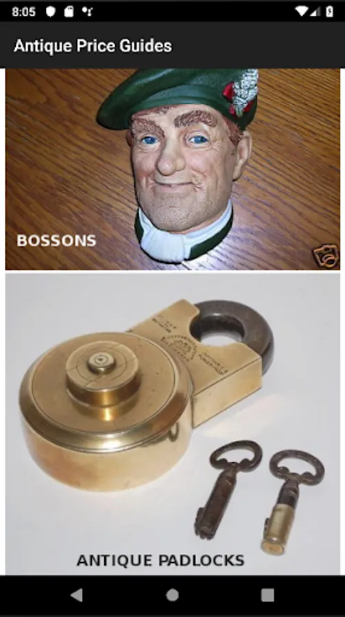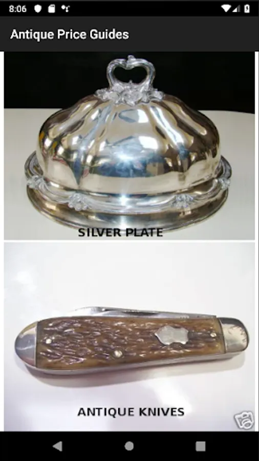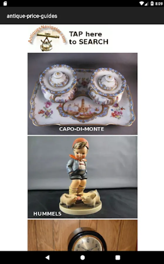 AntiquesNavigator.com presents our free antiques and collectibles price guides. Use our free guides to find the value of your antiques and collectibles or just browse the price guides and be envious of all the great antiques and collectibles sold in the past.