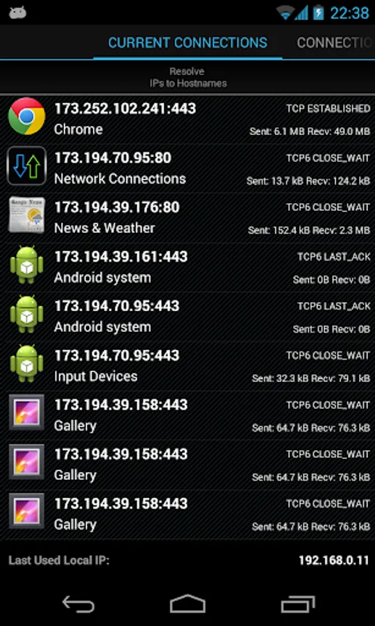 Powerful tool that displays and monitors (tracks) all inbound and outbound connection from and to your Android device. A low-level connections capture module ensures best performance with a minimal battery usage.