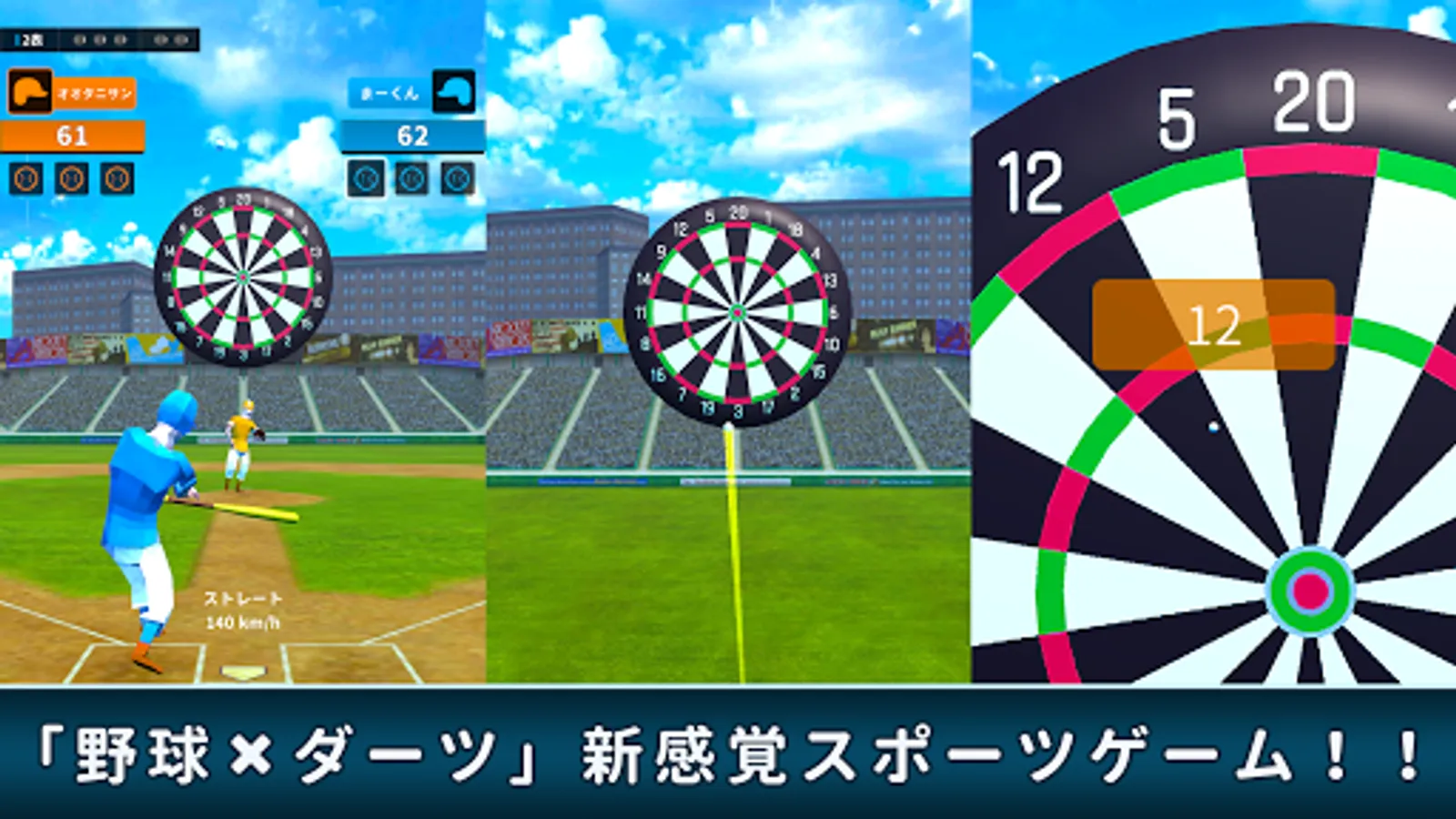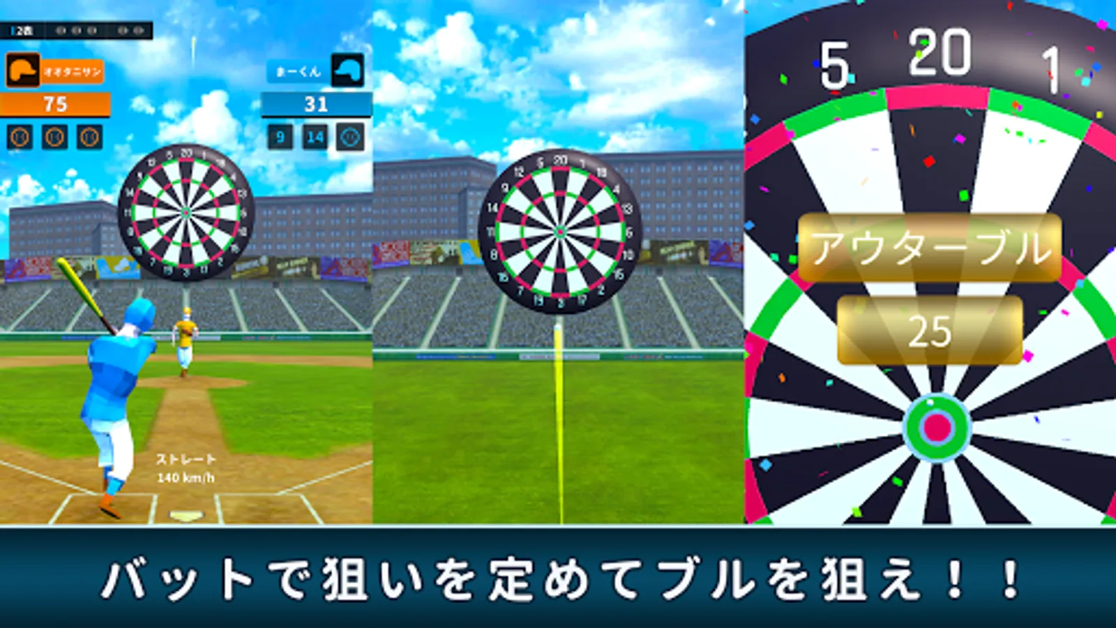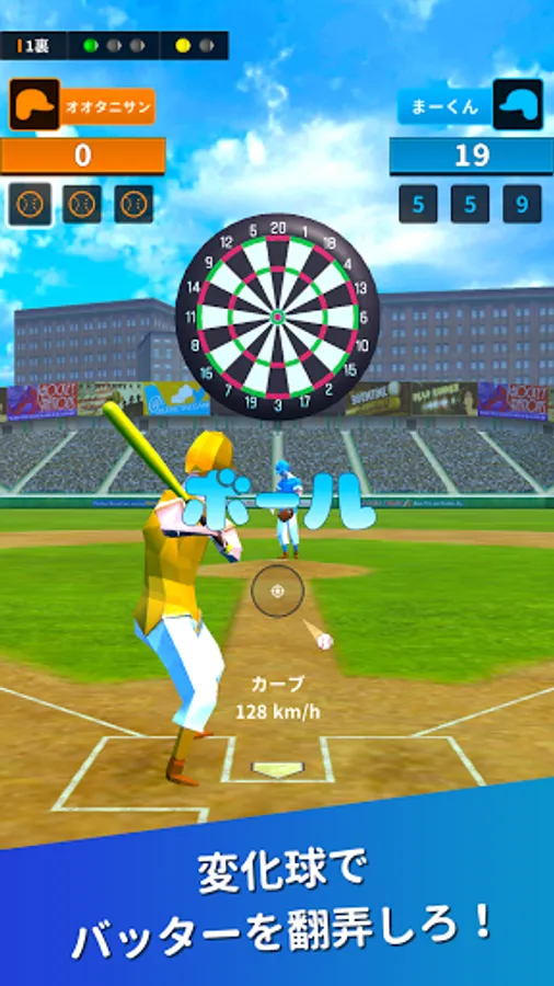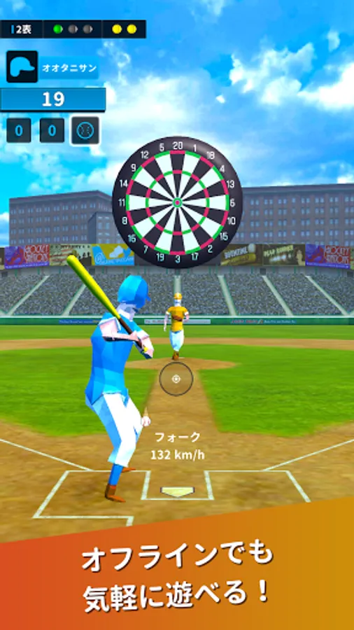 Hit the ball thrown by the pitcher back with the bat and hit the dartboard like an arrow.