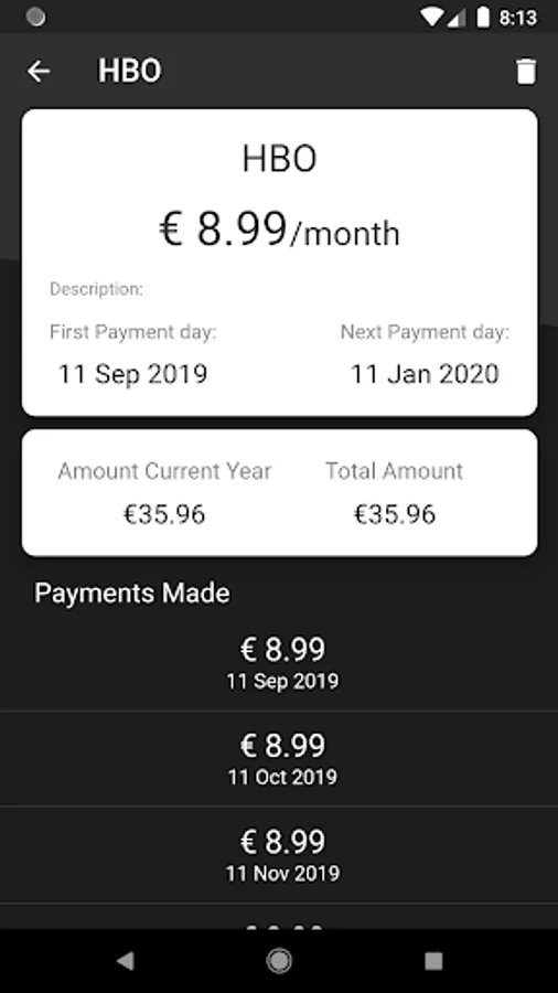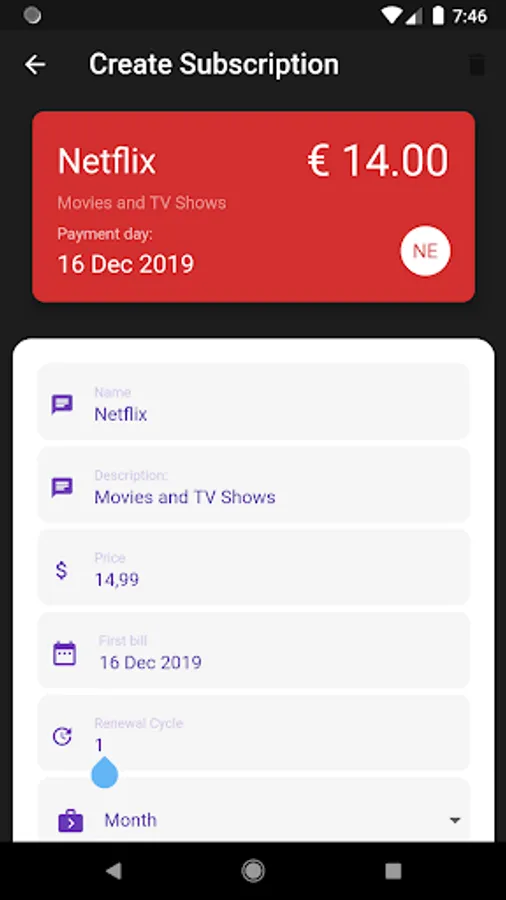 - Add important data for each subscription (description, payment start, payment method and notes)