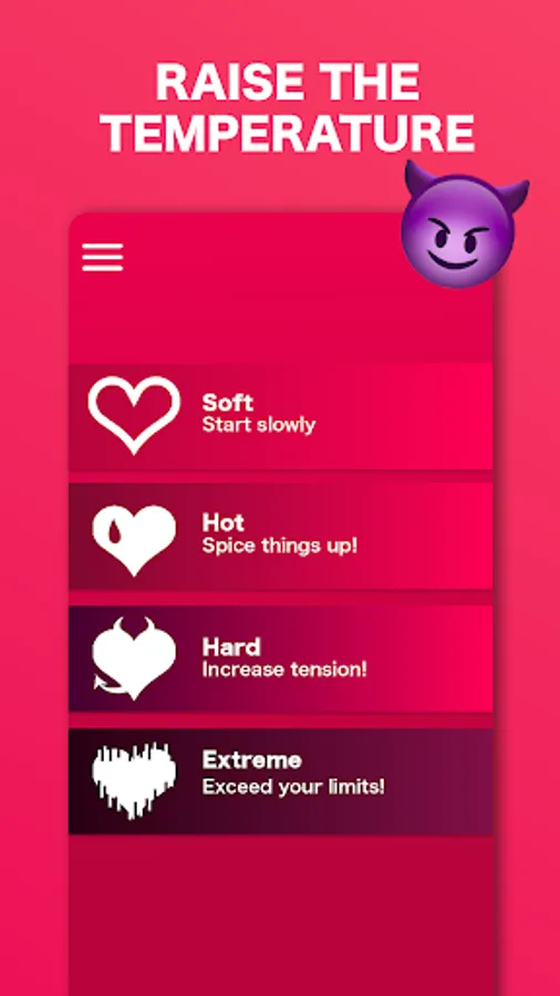 • EXTREME. Be ready for anything! With this level, get ready for night of unforgettable excitement! This level is a favorite of couples.
