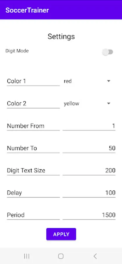 Soccer trainer is a simple application to train your ability to scan the field from behind. A profession player scans the field 6-8 times pro 10 seconds. A good player scans the filed approximately 3-4 times. The app helps you to improve your scanning ability. When training the pass drills place a smartphone behind you and run the app. When a ball is approaching your give a quick cast behind to see the color and perform an appropriate action. For example, if you see red color you plays back immediately. If you see a yellow color you first keep the ball and then play back. You can adjust the frequency of color change by using the settings. If you do not have a partner to play with you may use either a bench or a wall. The rest depends on your fantasy. Enjoy!