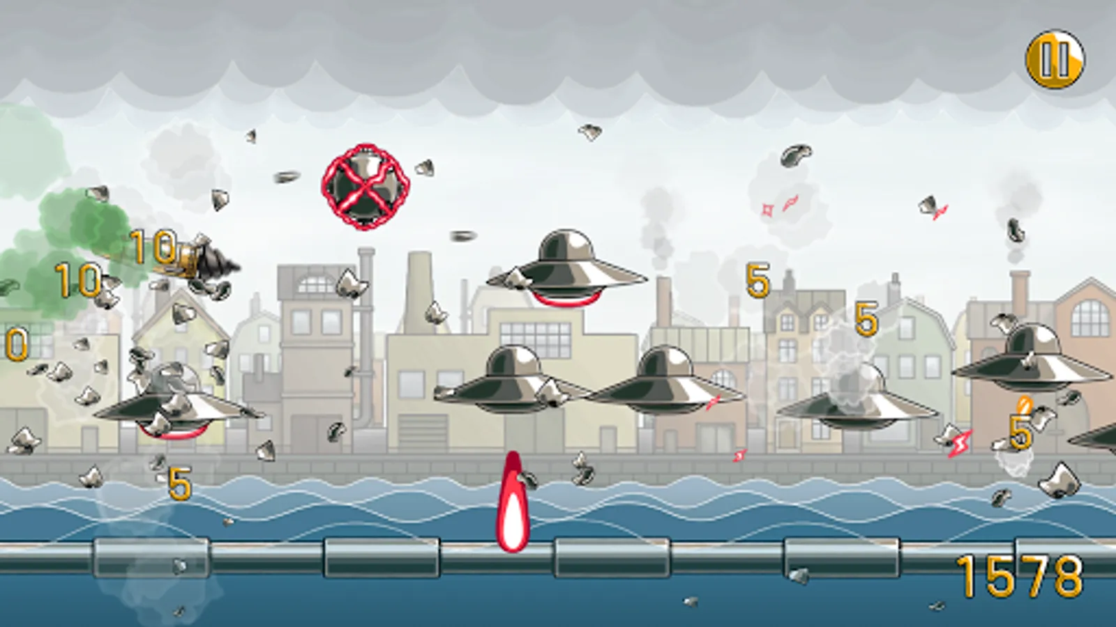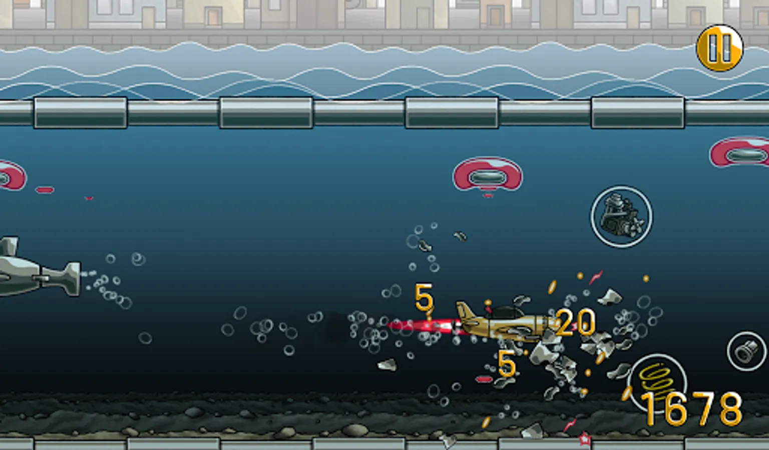 Play through a series of missions in which you'll have to avoid mines & torpedoes and destroy enemy flying saucers & laser shooting sharks. Every mission comes with a new challenge, and you’ll have to tackle your way through the air, the water and the ground.