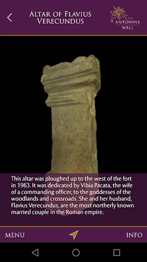 This application allows you to explore, and learn more about, the Antonine Wall, part of the Frontiers of the Roman Empire World Heritage Site. The Antonine Wall was a turf defence built by the Romans around 142 AD, across the central belt of Scotland. Today, there are a number of forts and fortlets, a bathhouse, and impressive remains of the ditches and banks within easy reach of towns and railway stations. Download the app and experience 360° virtual reconstructions, ‘handle’ 3D models of artefacts, and explore the sites along the Wall - even from your armchair!