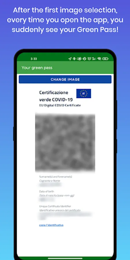 - At first Select your Green Pass image and then every time you need the Green Pass, just open the app you'll suddenly view your Green Pass image. No more clicks, no internet connection needed, no more time wasted finding your Green Pass.