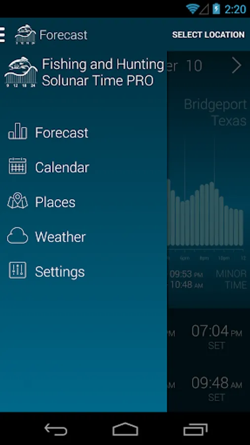 Based on the Solunar Tables theory application will help you to determine as precisely as possible the feeding of all types of fish and wildlife. Depending on the position of the moon and its phases and the position of the sun you will have the information about best time for fishing or hunting.