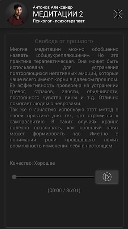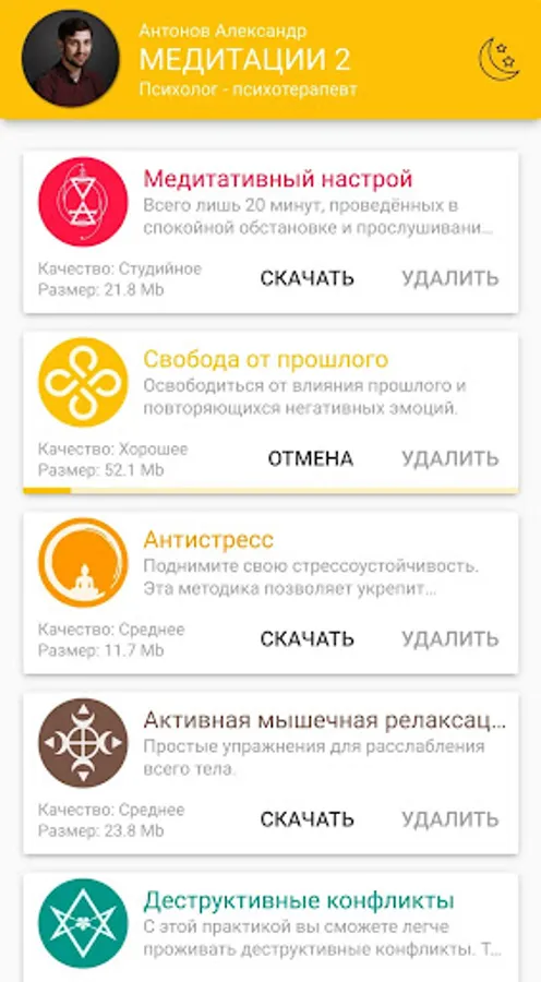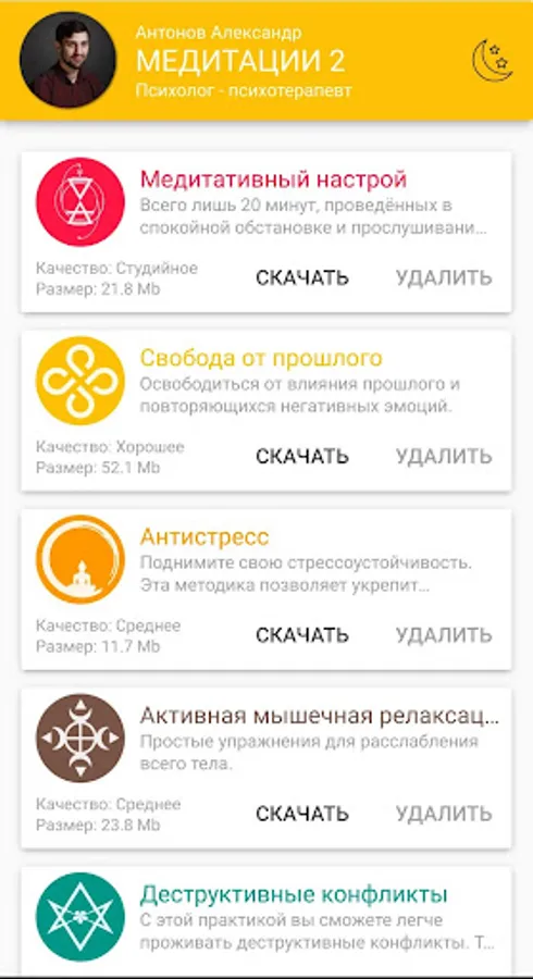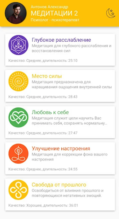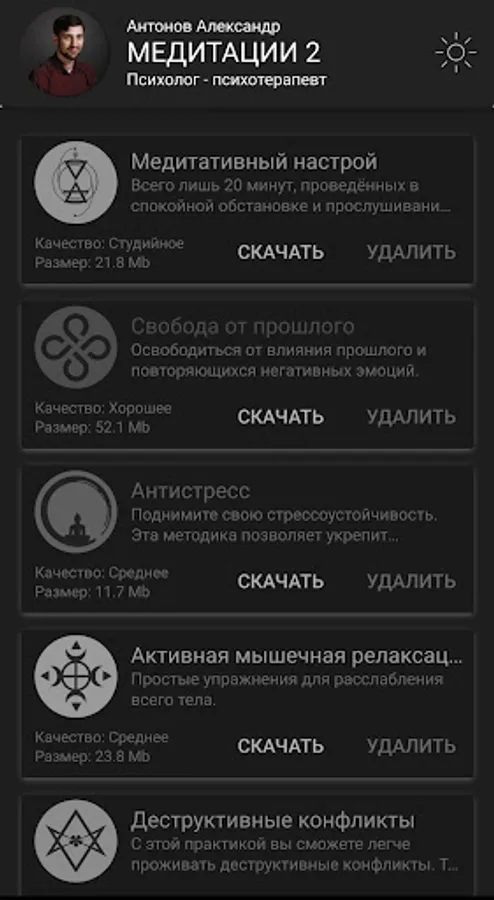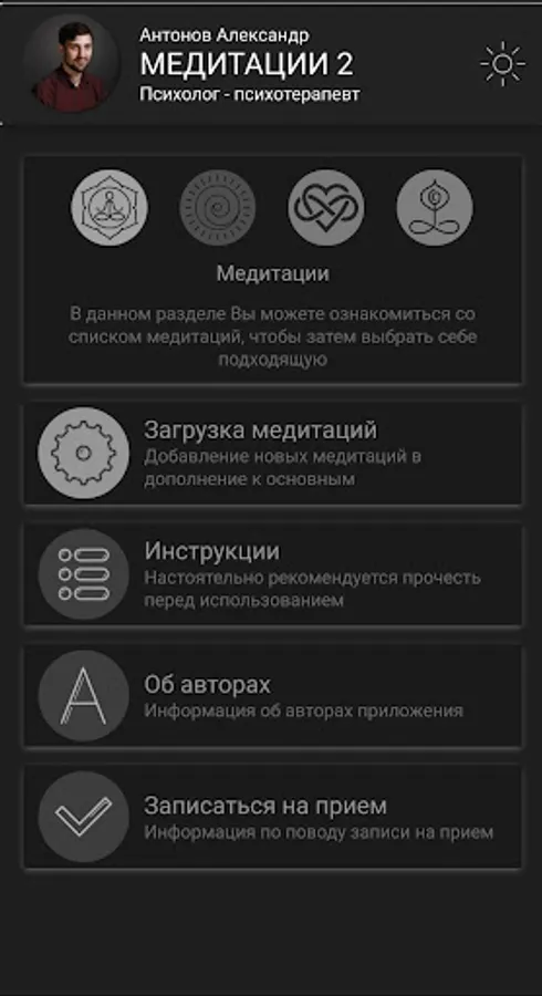 The second issue of the meditation program of Alexander Antonov, psychologist-psychotherapist. New recordings will open four techniques for you: mood improvement, a place of power, self-love and deep relaxation. They are set by default.