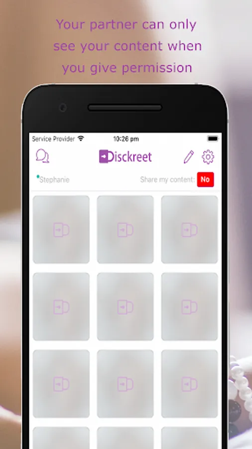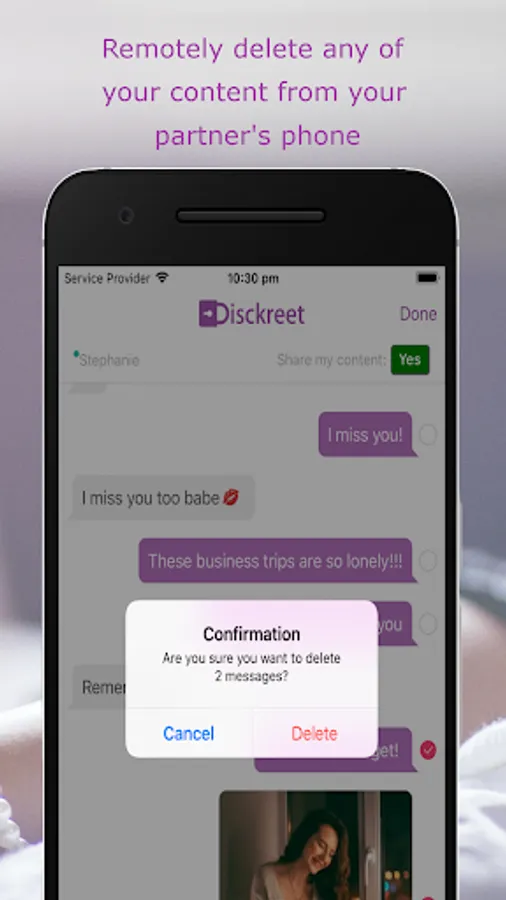 Unlike other messaging apps, when you share your content in Disckreet you do not give up ownership of it. Not only do you control when, and if, your partner can view your content but Disckreet also lets you remotely delete it from their phone. Delete single messages, photos and videos or everything you have ever shared - You always own your own content.