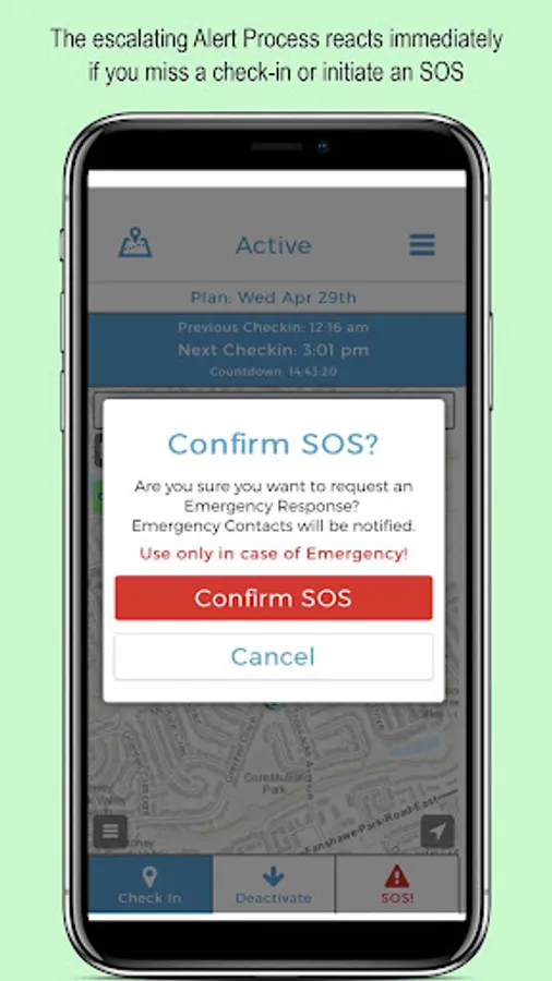 - The escalating Alert Process reacts immediately if you miss a check-in or initiate an SOS