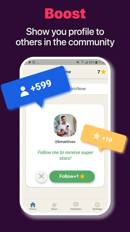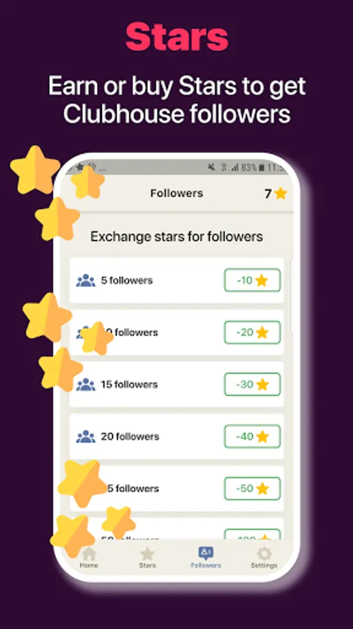 Earn stars to promote your profile to users across the “Club fans” community. The more users that you follow, the more followers you get. Or you can pay for stars for big boosts to your profile. “Club fans” is the #1 app for getting real, new Clubhouse Followers!