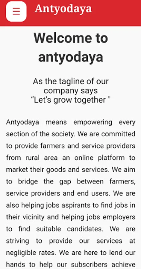 Antyodaya means empowering every section of the society. We are committed to provide farmers and service providers from rural area an online platform to market their goods and services. We aim to bridge the gap between farmers, service providers and end users. We are also helping jobs aspirants to find jobs in their vicinity and helping jobs employers to find suitable candidates. We are striving to provide our services at negligible rates. We are here to lend our hands to help our subscribers achieve success in their respective fields. we welcome you in 'Antyodaya - Lets grow together' family.