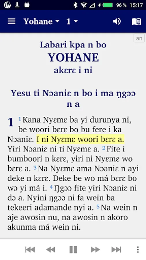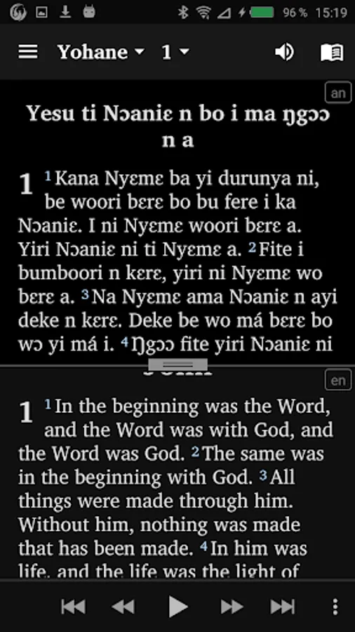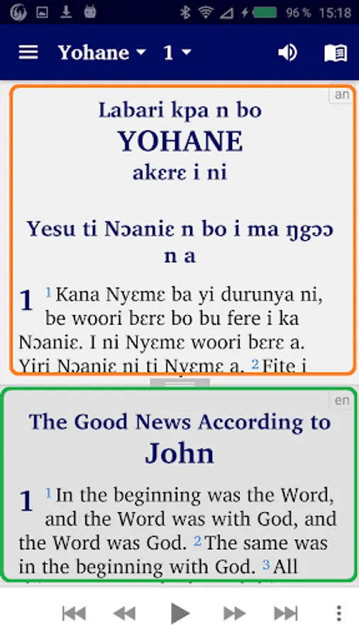 - «verset par verset» pour afficher un verset en Anufo suivi du même verset en français ou en anglais.