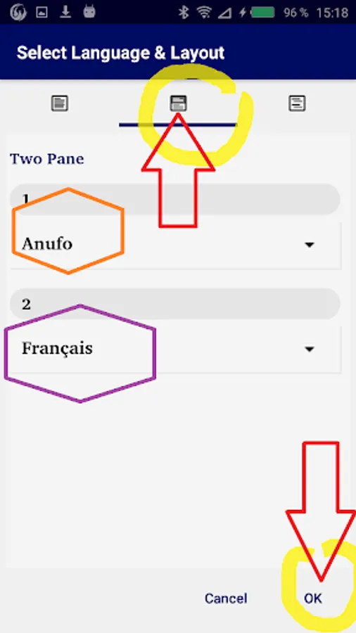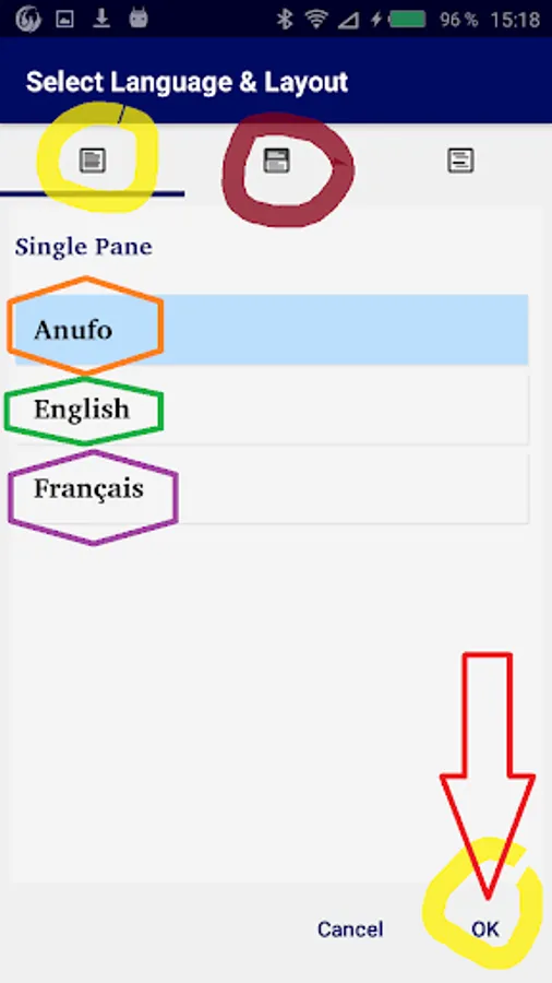 - "two panes" to display the Anufo at the top and the French or English version at the bottom