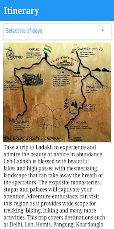 This app helps in providing information about the ways to reach leh, places to visit, itinerary, and shows all the locations of these places on the map. The app helps in preparing in advance for the trip, taking precautionary measures and planning the trip.