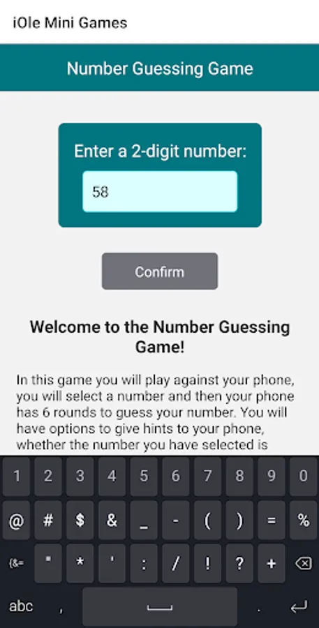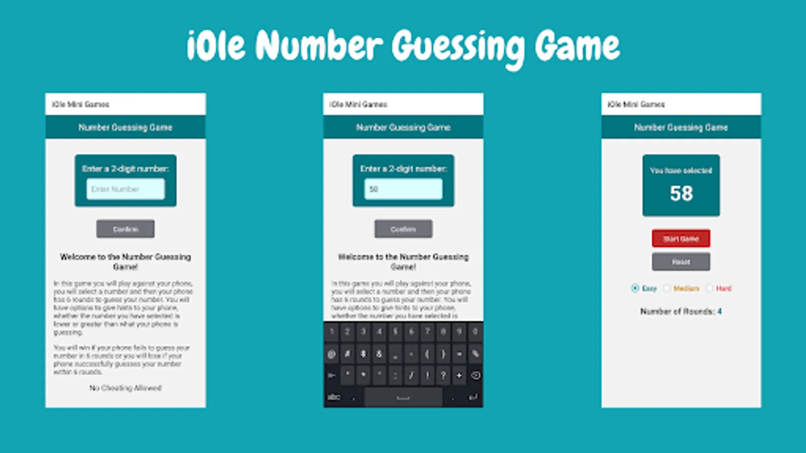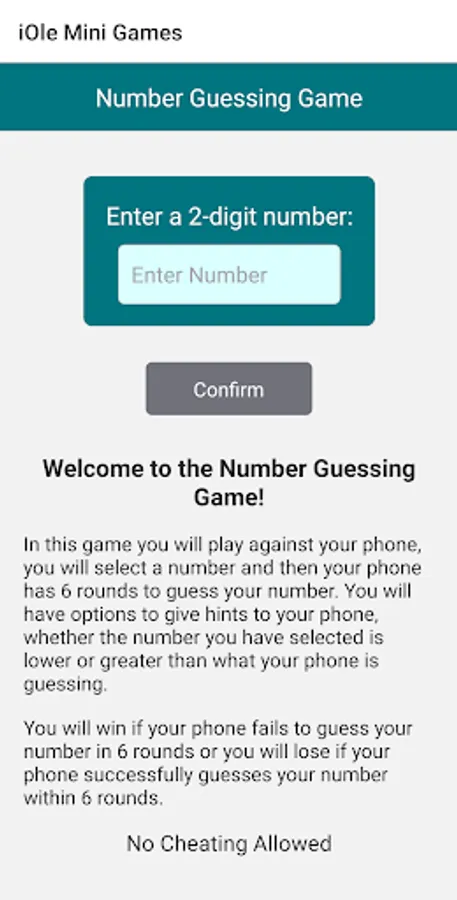 In this game you will play against your phone, you will select a number and then your phone has selected rounds to guess your number. You will have options to give hints to your phone, whether the number you have selected is lower or greater than what your phone is guessing. You will win if your phone fails to guess your number in selected rounds or you will lose if your phone successfully guesses your number within selected rounds.