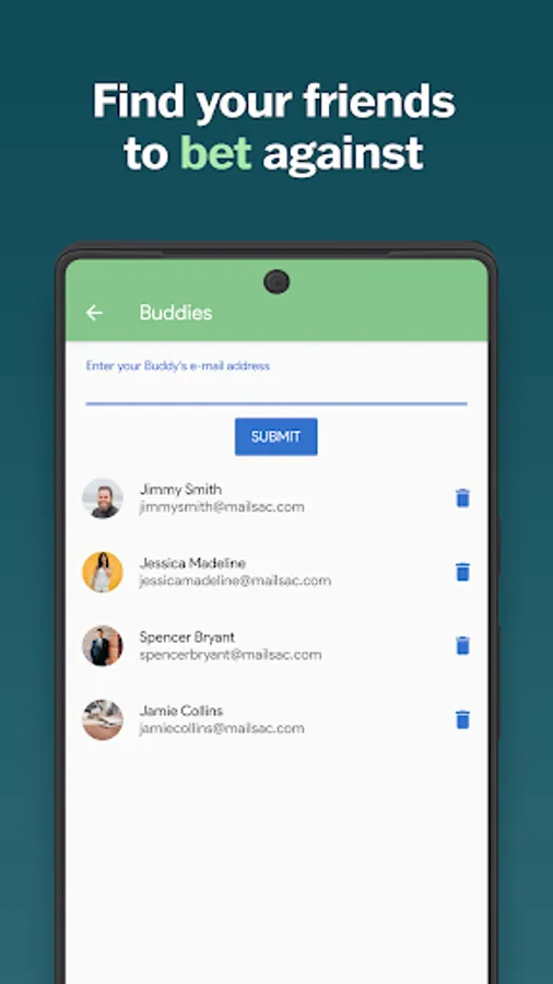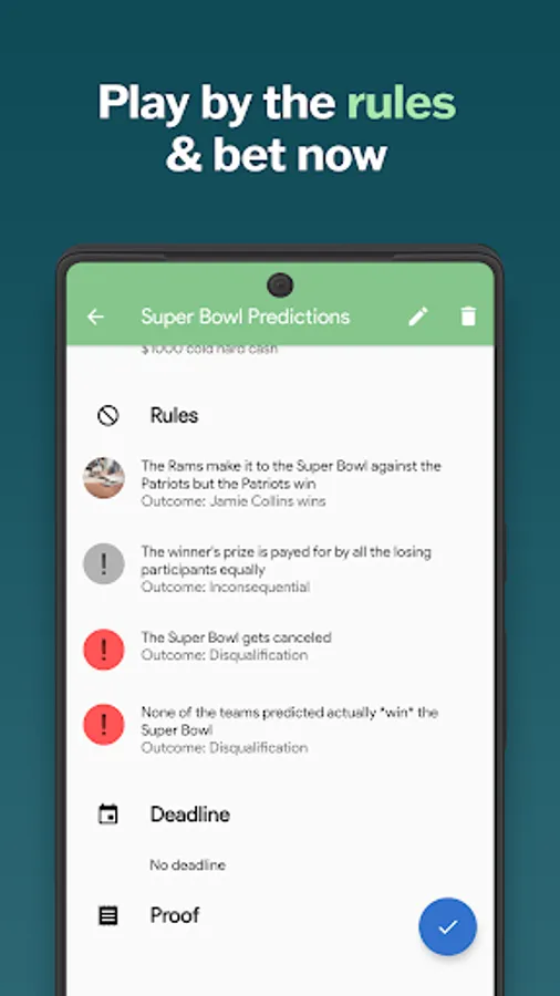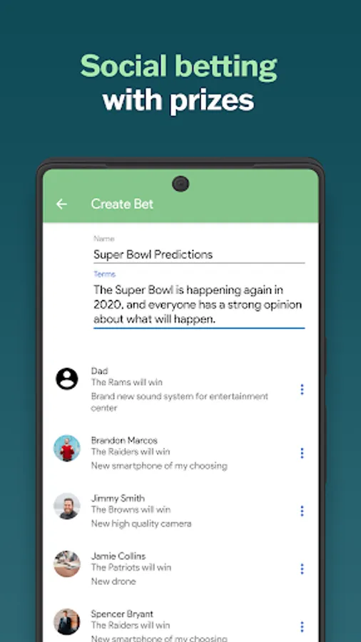 - Make bets against your friends and for sports and events!
